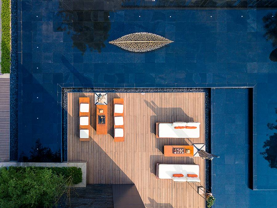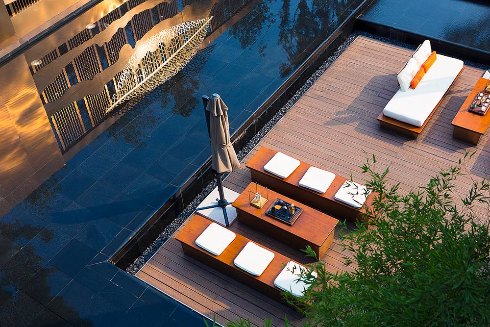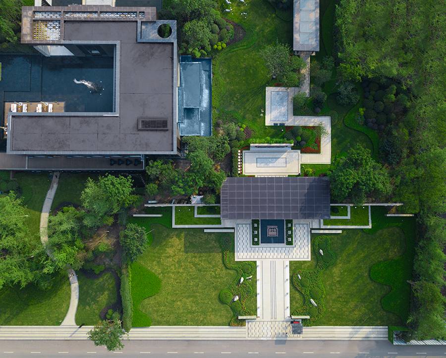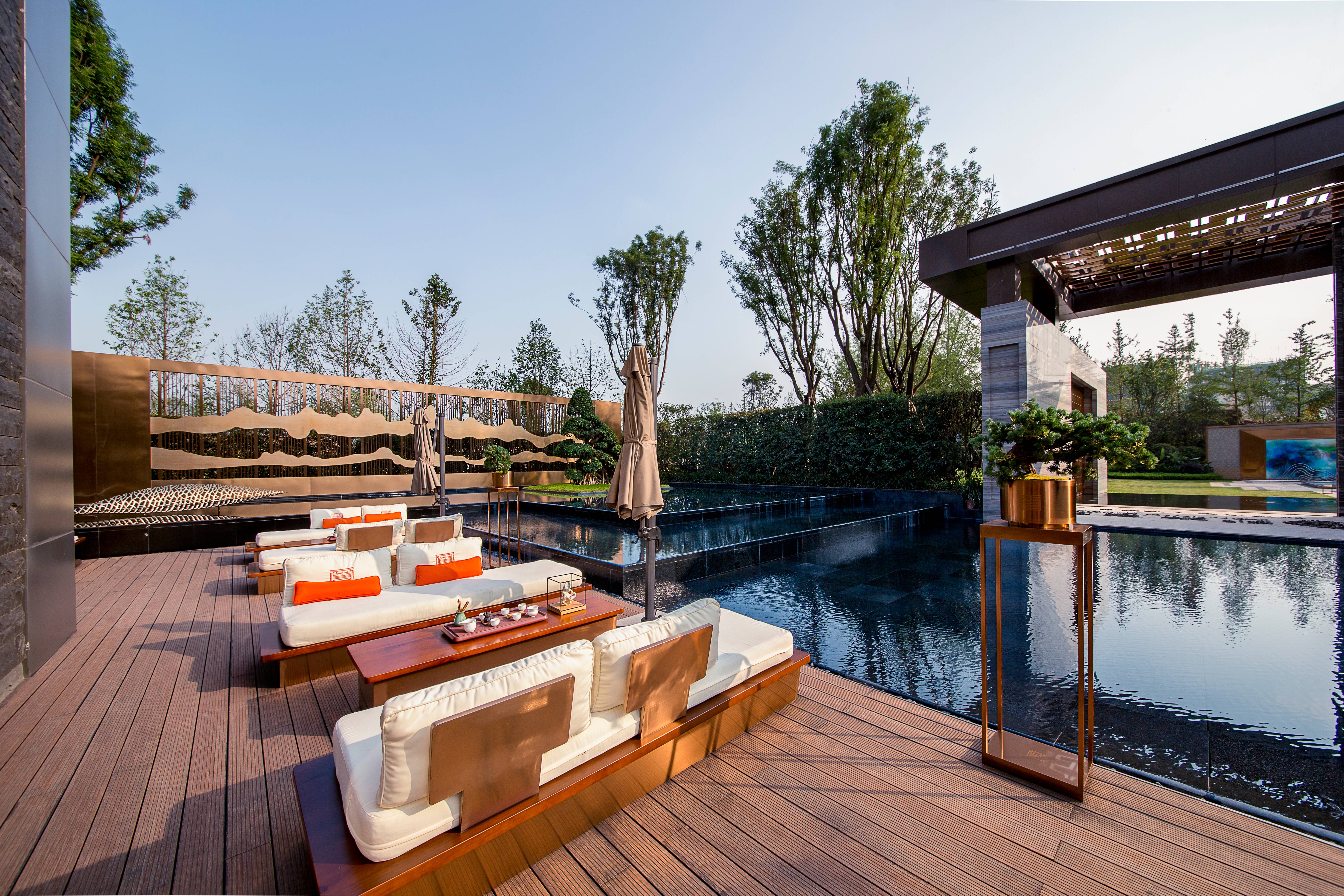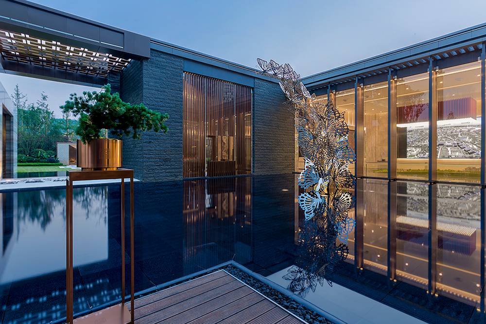在傳統(tǒng)美學(xué)的規(guī)范下,運用現(xiàn)代的材質(zhì)及工藝,以“點、線、面”的元素再造,構(gòu)建東韻西境的居住形態(tài),演繹傳統(tǒng)禮序與文化回歸。水景中的一葉扁舟,與水岸上禪茶一味的坐席,繪成一幅淡雅可貴的空間氣質(zhì),難得出則繁華、入則寧靜中,傳承東方園林尊崇感,以“天人合一”之設(shè)計初心,融貫中韻西境千景,咫尺自然間表達(dá)生活奧義。