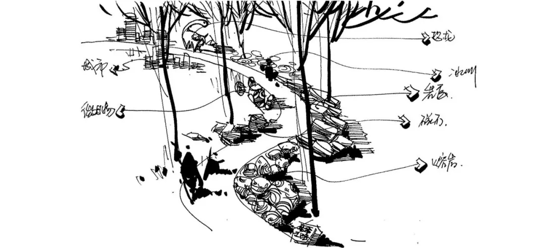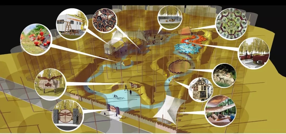 設(shè)計(jì)將物種變遷過(guò)程延展到地球的生命之路,將地球誕生、生命出現(xiàn)等等重要的階段以自然物的形態(tài)展現(xiàn)出來(lái),熔巖、冰川、磁石、巖層、綠色植物、微生物、動(dòng)物……用源于自然的材料復(fù)原自然的歷程,而蜻蜓正是這博大場(chǎng)景中微小的一員,人類又何嘗不該敬畏自然。場(chǎng)景結(jié)合體驗(yàn),在一條小徑上,給孩子一個(gè)體驗(yàn)億萬(wàn)年自然歷程的空間。