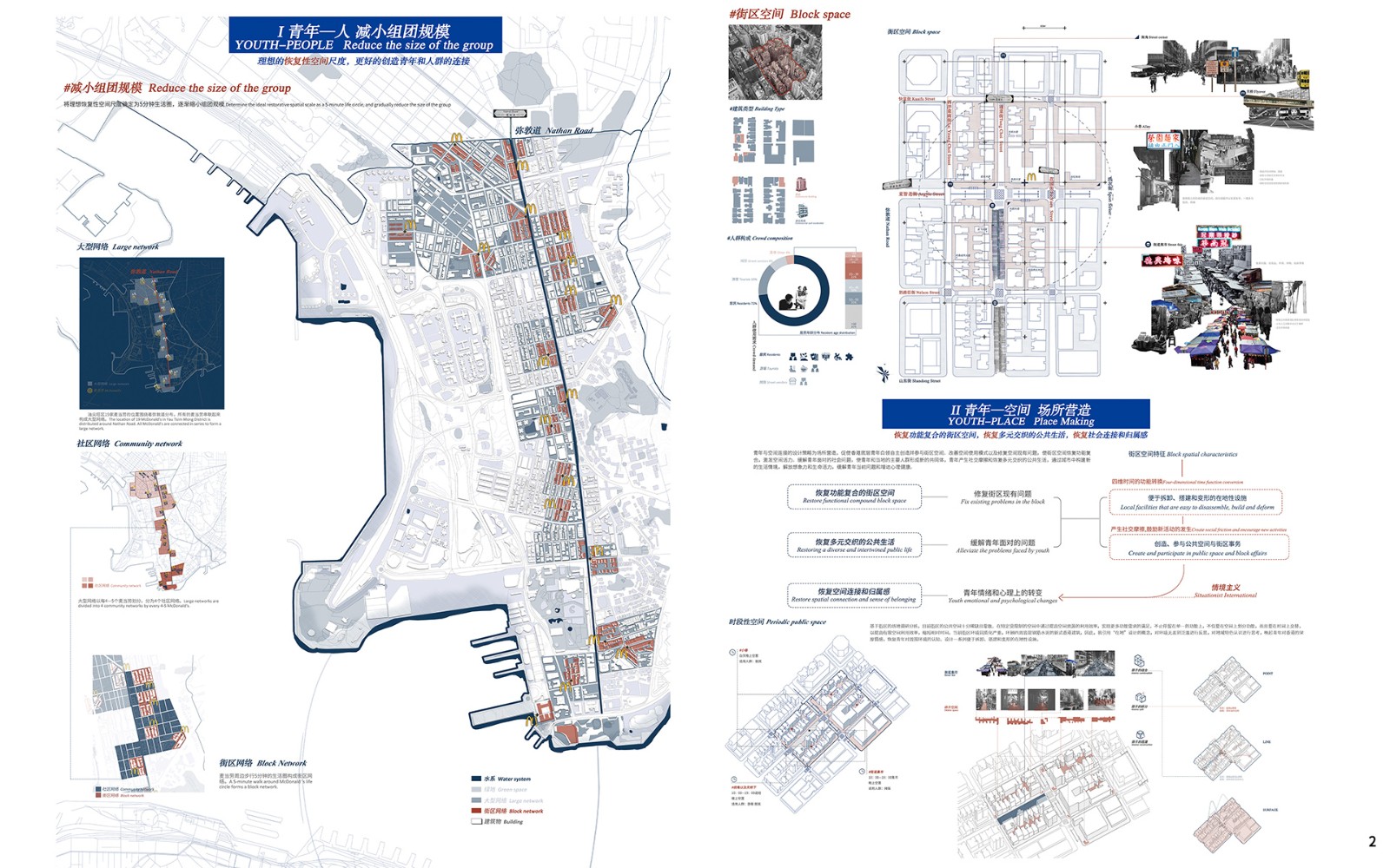 場(chǎng)地位于香港青年夜晚停留的24H麥當(dāng)勞最密集的油尖旺區(qū)。基于場(chǎng)地現(xiàn)狀,參考“社會(huì)恢復(fù)性城市”主義,針對(duì)原子化形成原因,將社會(huì)連接和空間修復(fù)應(yīng)用于原子化網(wǎng)絡(luò)的修復(fù)中,進(jìn)而把連接類(lèi)型拓展為四個(gè)系統(tǒng)——青年與人,青年與空間,青年與自然連接,青年與數(shù)據(jù)交互。