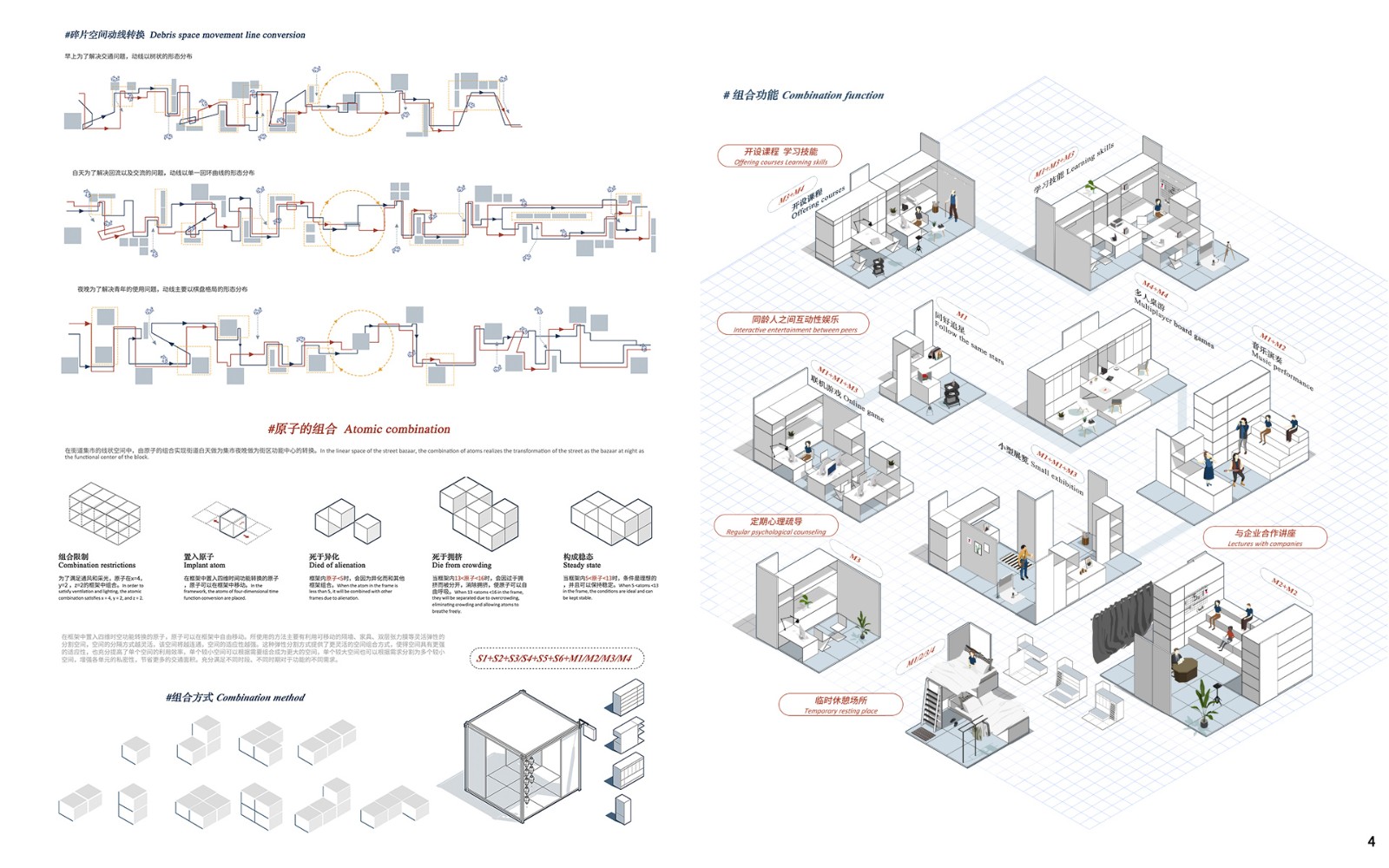 The corresponding design strategy is: reduce the size of the group, reduce the site to the ideal restorative spatial scale, and better create a connection between youth and people. The building of the place combines the spatial characteristics of the block, through the functional transformation of the atom's four-dimensional time and space, responds to the atomization with the construction, splitting, and combination of atoms, creating a block space with complex functions and restoring diverse public life and social connections. Natural restoration, green space is a benign resource of restorative space, and has become the object of promoting the justice of small-scale space and restoring youth perception. Interactive cities, dynamically adjust the restorative space in real time, and quickly respond to social isolation through data sharing.