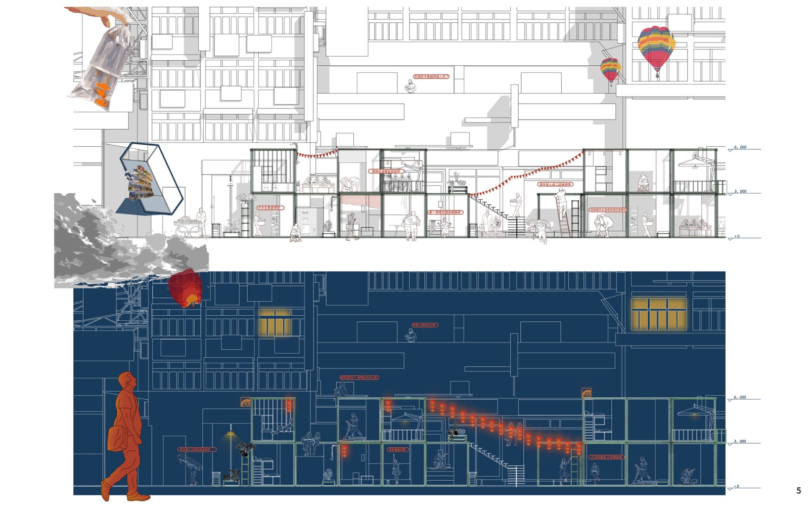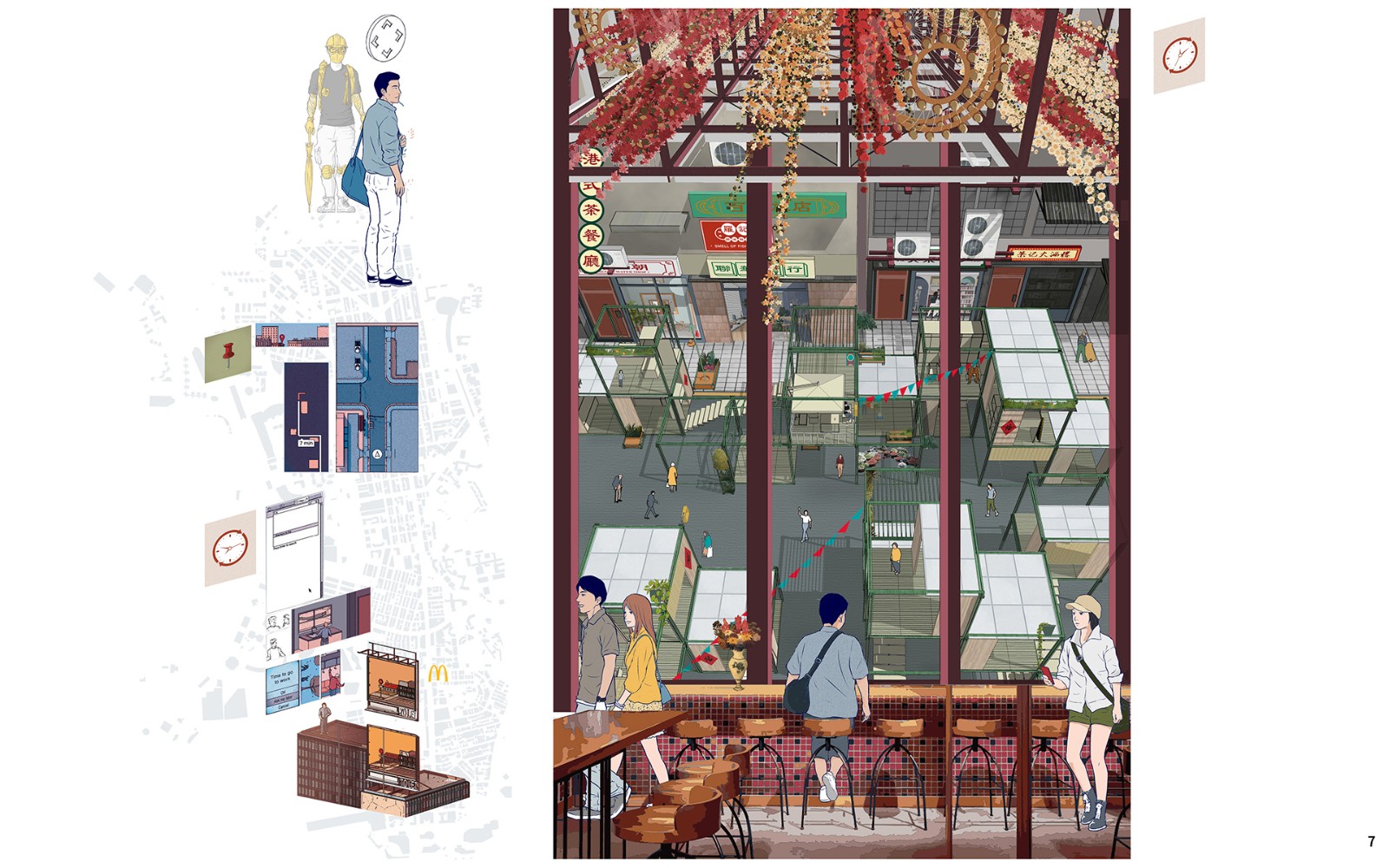 The venue is located in Yau Tsim Mong District, the most densely populated area of 24H McDonald's in Hong Kong. Based on the current situation of the site, referring to the "social restorative city" doctrine, the social connection and spatial restoration are applied to the restoration of the atomized network for the formation of atomization, and then the connection type is expanded to four systems-youth and people Connect with space, youth and nature, youth interact with data.