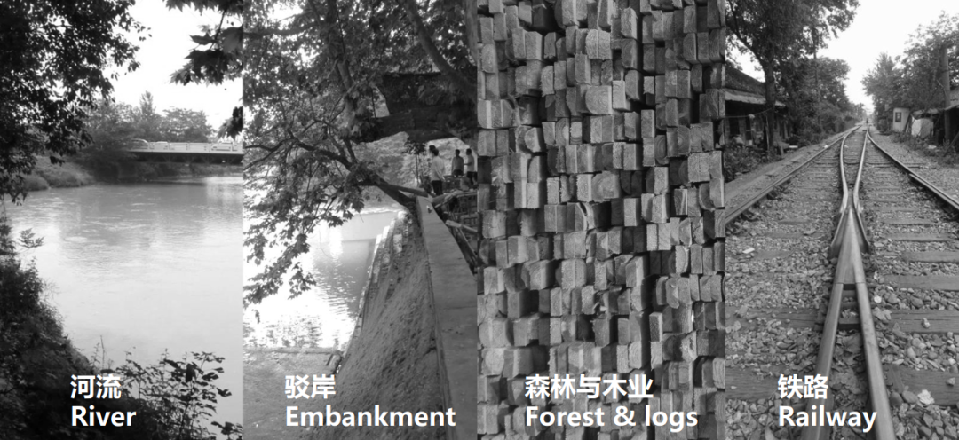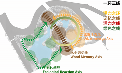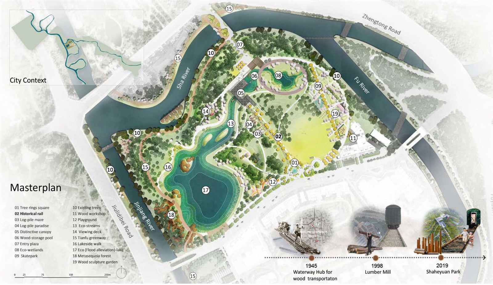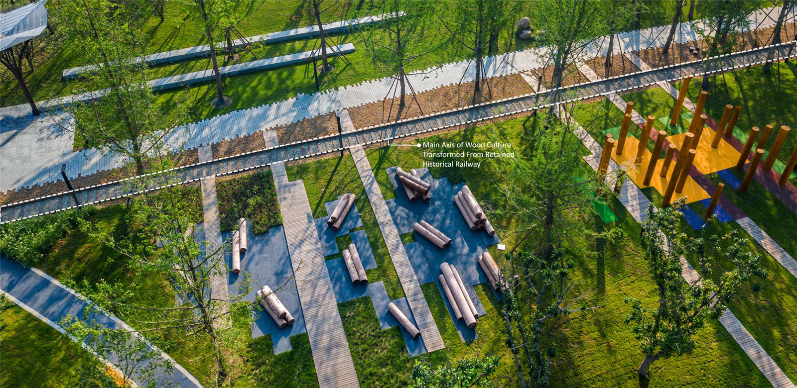 Wood was chosen as the main element of Shaheyuan Park’s design. Having witnessed the development and evolution of the site, wood represents the feelings and memories connected with the land. It is used in the narrative to translate the history and memory of the site. The evolution of the site, from being a historical water transportation hub to a lumber mill, was depicted through the wood succession transformation cycle called ”forest-lumber-transportation-processing-storage.” The relationship of "forest-wood-human" has also been infused into the park.