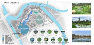 公園是城市綠廊的重要節(jié)點,基于可持續(xù)發(fā)展視角,運用系列低干擾措施優(yōu)化原始生態(tài)環(huán)境。以保留河道周邊的現(xiàn)狀大樹為基礎(chǔ),并從生態(tài)系統(tǒng),季相變化,空間視線,植物色彩,四個方面,完善濱河植物組團的群落結(jié)構(gòu),營造多樣的動植物生境。 在水環(huán)境維持與提升策略方面:首先,公園引入沙河來聯(lián)通城市水系,允許河水進入場地,并且在公園地勢最低處建立生態(tài)湖泊,在暴雨或洪水時可調(diào)節(jié)水位,來恢復場地原本的滯洪功能。其次,雨水徑流經(jīng)過生態(tài)草溝,雨水花園,濕地、生態(tài)溪流、滯留草坪等一系列海綿設施補給生態(tài)湖,同時也確?;氐胶恿鞯囊缌魉玫絻艋瓦^濾。湖底水下森林的設計為水生物多樣性提供了條件,兼具景觀與生態(tài)價值。