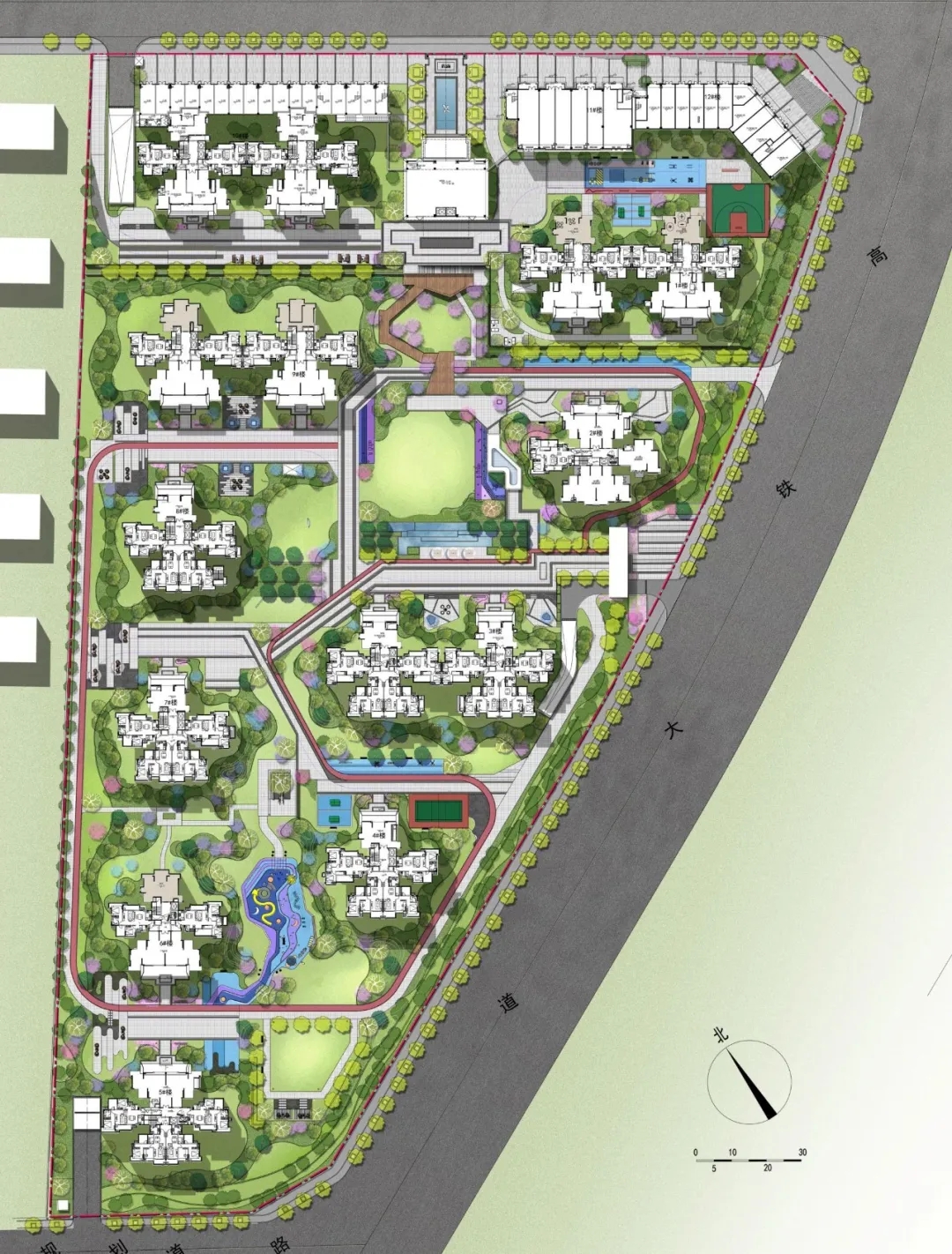 項(xiàng)目總占地約77畝,包含住宅和商業(yè)。項(xiàng)目定位為藍(lán)潤“春風(fēng)系”產(chǎn)品,非核心區(qū)的城市中端住宅,產(chǎn)品風(fēng)格為目前廣泛接受的現(xiàn)代輕奢風(fēng)格。針對(duì)剛需剛改客群,打造小而精的景觀,強(qiáng)調(diào)景觀參與性、觀賞性。