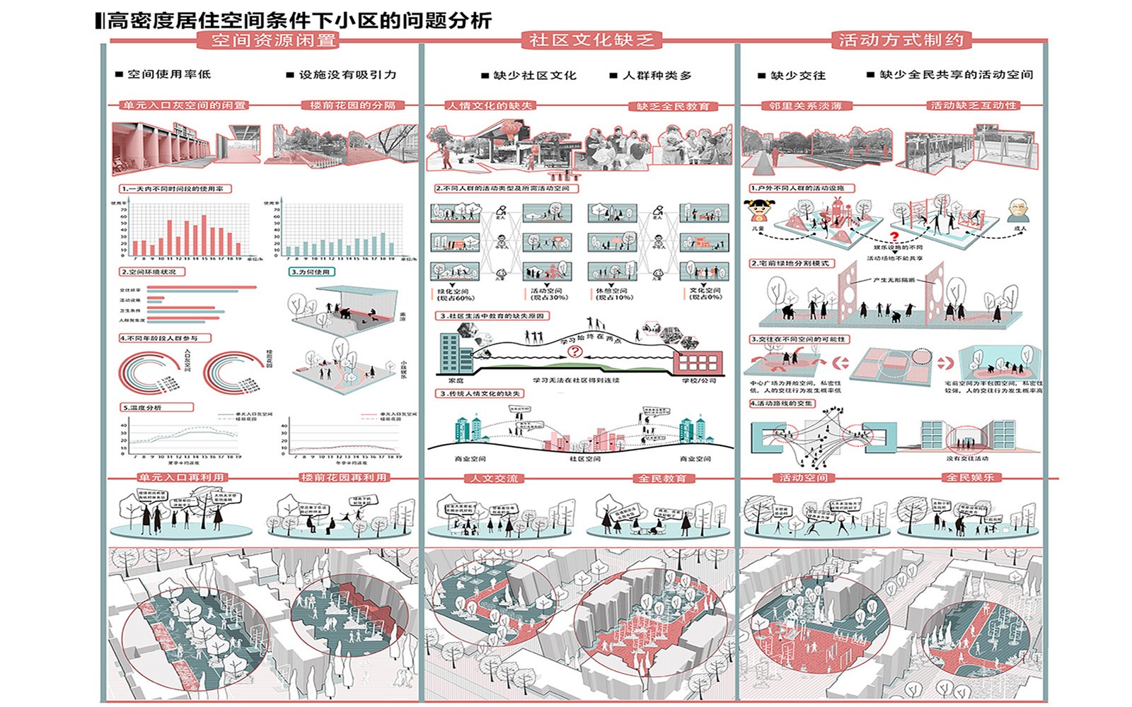 小區(qū)層—人的活動(dòng)空間單一,在疫情來(lái)臨的時(shí)候,現(xiàn)有的空間以及活動(dòng)方式不能滿足密集的人群需求,分析高密度居住空間常態(tài)下的空間問(wèn)題時(shí)(問(wèn)題一:空間資源閑置,問(wèn)題二:文化活動(dòng)缺失,問(wèn)題三:活動(dòng)方式制約),隨著疫情中各類人群的回歸與隔離,在原本的空間問(wèn)題上進(jìn)行瞬時(shí)化分時(shí)段的彈性設(shè)計(jì),提供疫情前,疫情中,疫情后的人性化居住空間,滿足人群的活動(dòng)需求。(設(shè)計(jì)重點(diǎn))