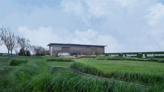 人流從西側(cè)到達(dá),首先映入眼簾的是展示區(qū)后場(chǎng)的景觀,景觀設(shè)計(jì)以低平起伏的地形和耐鹽堿的鄉(xiāng)土草本植物再現(xiàn)了蒼茫的場(chǎng)地原生特質(zhì),最大化烘托出遠(yuǎn)處的銷售中心建筑,考慮到一年后的建筑施工,只做少量的微地形處理,而大部分區(qū)域不做標(biāo)高的抬高,由此形成的下凹綠地成為后場(chǎng)雨水的滯納濕地。