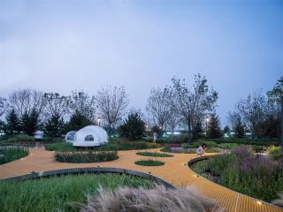 When visitors arrive from the west side, the first thing that comes into view is the landscape in the backcourt of the demonstration area. Its landscape design reproduces the original characteristics of the vast site with low and undulating terrain and salt-tolerant native herbs, and highlights the distant sales center buildings to the greatest extent. Since the construction work will start one year later, only a small amount of micro-topography treatment has been be done, and the elevation is not raised in most areas. The concave green space thus formed becomes a stagnant wetland for rainwater in the backcourt.