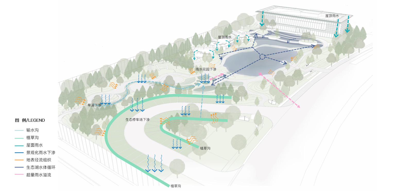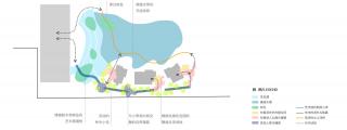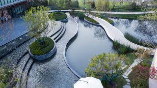 The frontcourt area is about 157 m× 60 m, and the planned parking lot and three model rooms occupy one fifth of the area, so the site space is rather cramped. According to the design, the model rooms and operation space are arranged around the central Water Drop Lake, and three complementary and intersecting visiting routes are formed around the Lake. The water of Water Drop Lake comes from rainwater collected in the site, and the cascade lake surface is formed due to the height difference between the sales center (with a building elevation [±0] of 4.1m) and the site (with a elevation of 2.4m). It collects rainwater from building roofs and sites, and deliver it into the Great Lake.