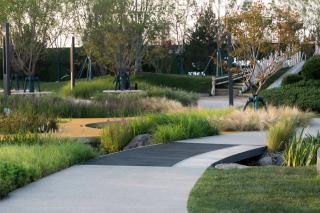 前場(chǎng)空間在滿足銷售期間功能需求的基礎(chǔ)上,希望以最小的拆改量過(guò)渡到未來(lái)公園,當(dāng)居民入住時(shí),大樹(shù)和水系都可以達(dá)到最理想的穩(wěn)定狀態(tài),也可以在銷售期間使參觀者體驗(yàn)到未來(lái)社區(qū)公園的真實(shí)場(chǎng)景。