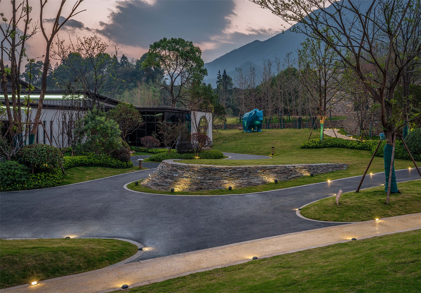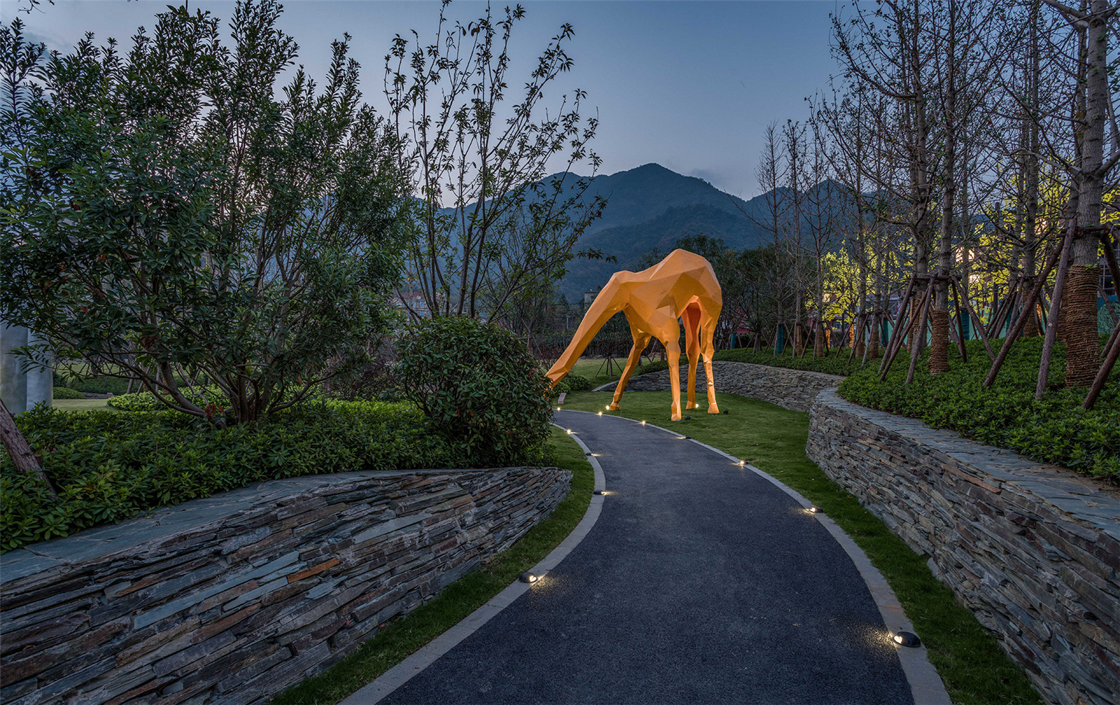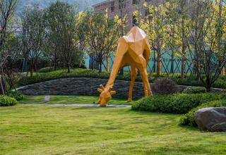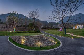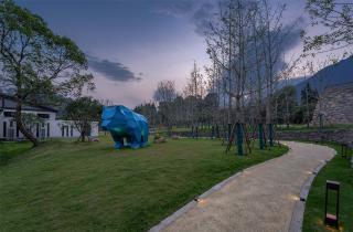 花園內(nèi)現(xiàn)場(chǎng)面積比較大,高差比較大,利用毛石擋墻解決豎向高差問(wèn)題,同時(shí)結(jié)合大草坪設(shè)計(jì),創(chuàng)造多層次的空間變化;在大草坪上設(shè)置一些動(dòng)物裝置,營(yíng)造一種輕松、自然、趣味、神秘的度假氛圍,讓客人馬上進(jìn)入角色。