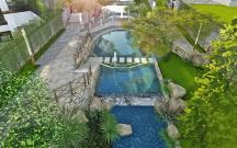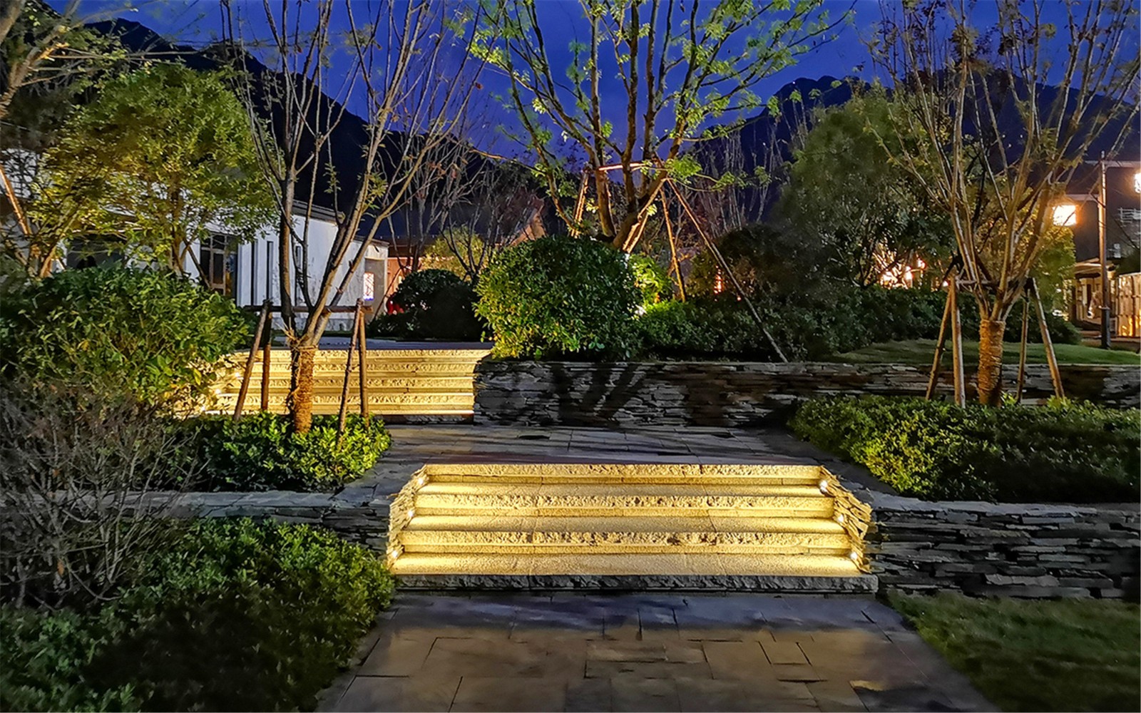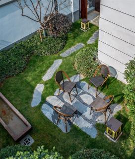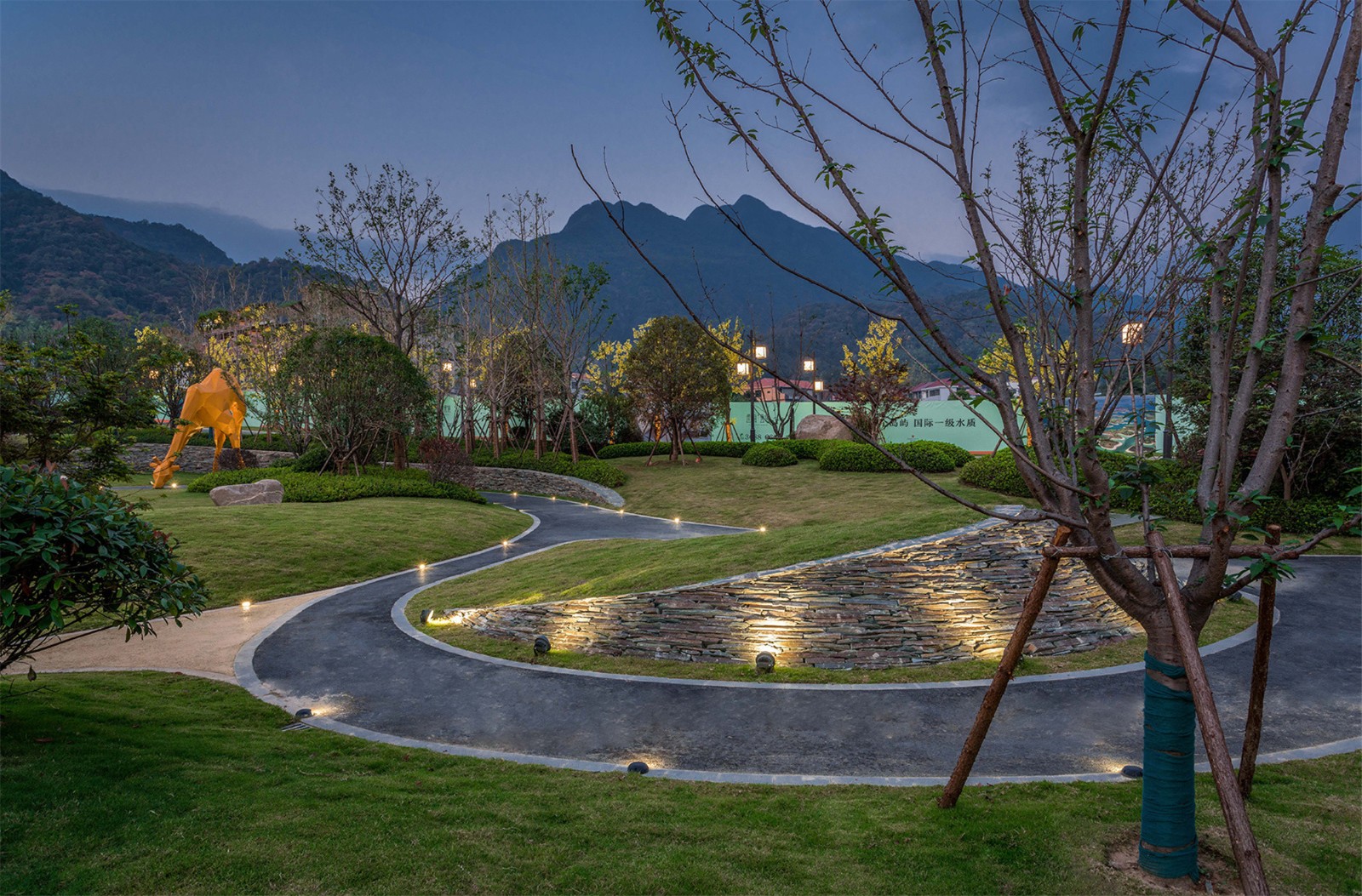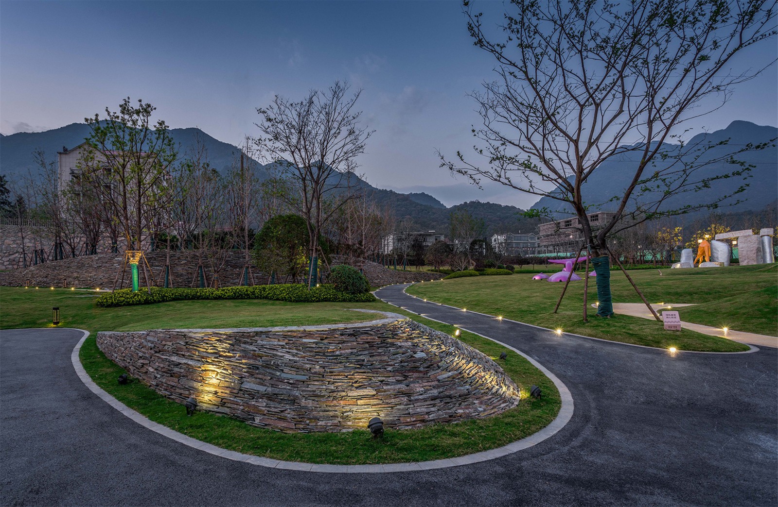 花園內(nèi)現(xiàn)場(chǎng)面積比較大,高差比較大,利用毛石擋墻解決豎向高差問(wèn)題,同時(shí)結(jié)合大草坪設(shè)計(jì),創(chuàng)造多層次的空間變化;在大草坪上設(shè)置一些動(dòng)物裝置,營(yíng)造一種輕松、自然、趣味、神秘的度假氛圍,讓客人馬上進(jìn)入角色。