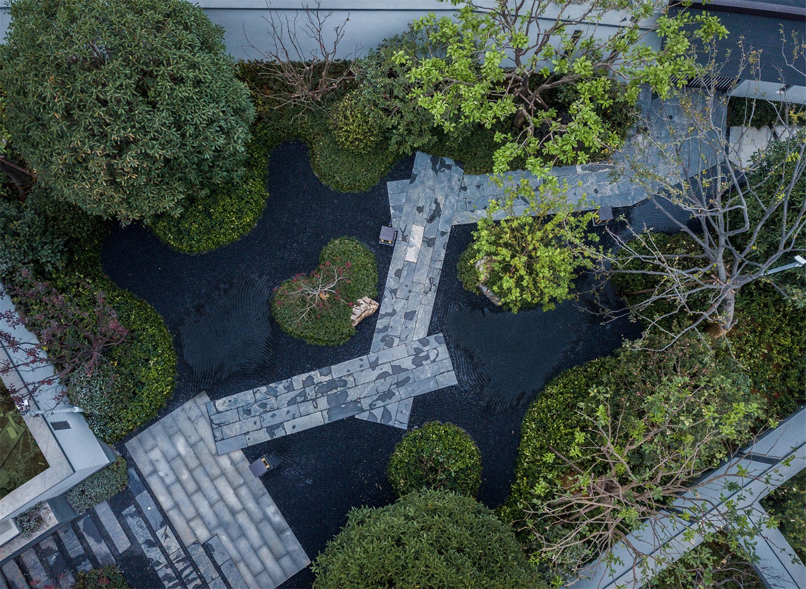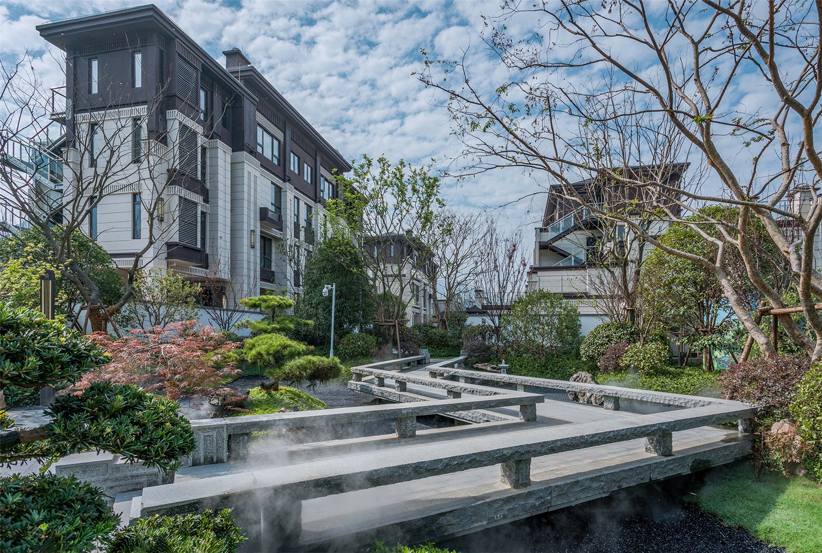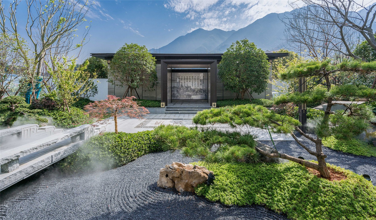穿過(guò)大門(mén),繞過(guò)屏風(fēng),從框景的構(gòu)造中望出,豁然開(kāi)朗,蜿蜒的石橋、蒼翠的松樹(shù)、與山石、礫石相互交錯(cuò),方寸之間,一步一景構(gòu)建可行、可望、可游、可居的東方禪意園林。