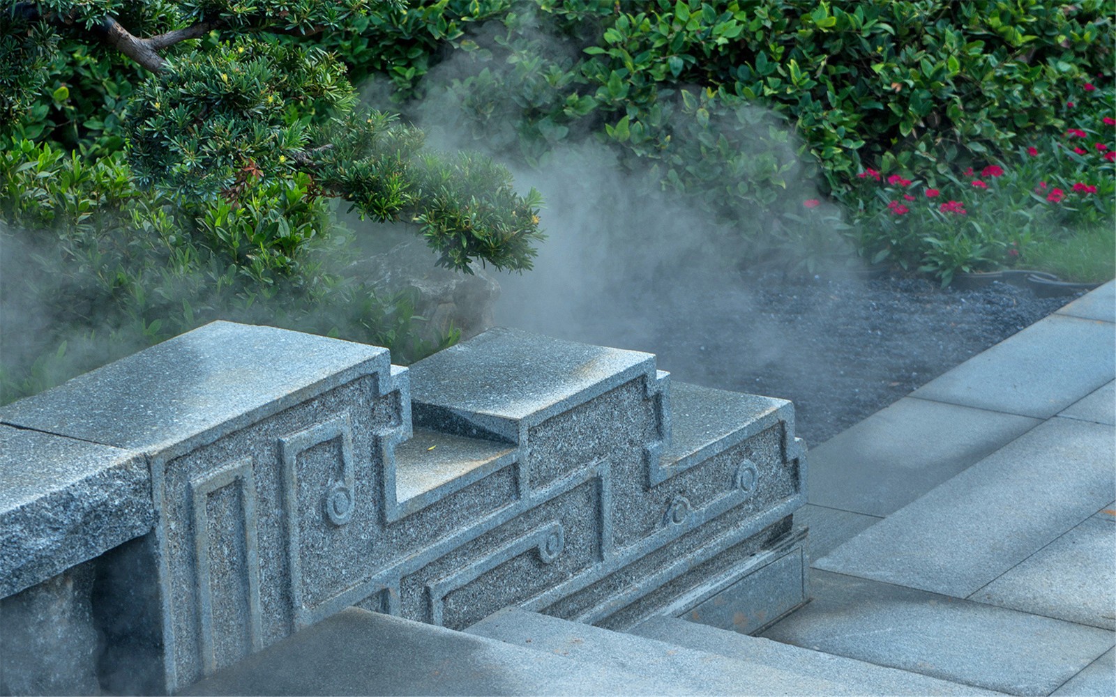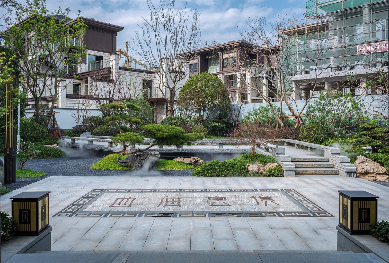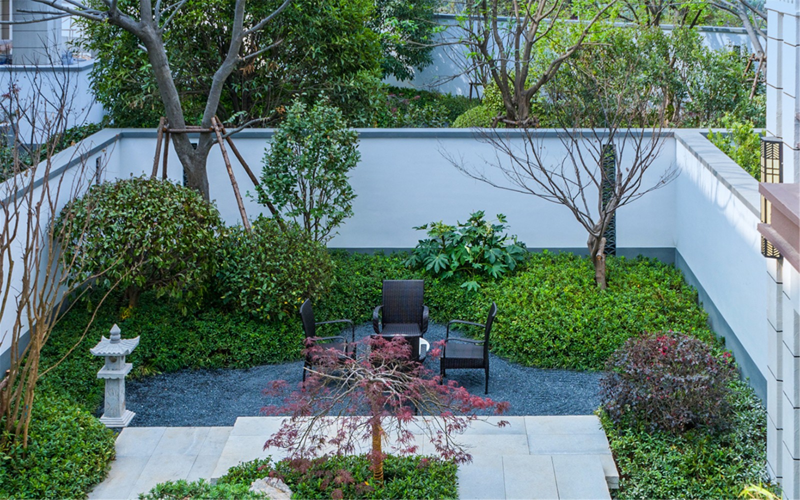 穿過(guò)大門(mén),繞過(guò)屏風(fēng),從框景的構(gòu)造中望出,豁然開(kāi)朗,蜿蜒的石橋、蒼翠的松樹(shù)、與山石、礫石相互交錯(cuò),方寸之間,一步一景構(gòu)建可行、可望、可游、可居的東方禪意園林。