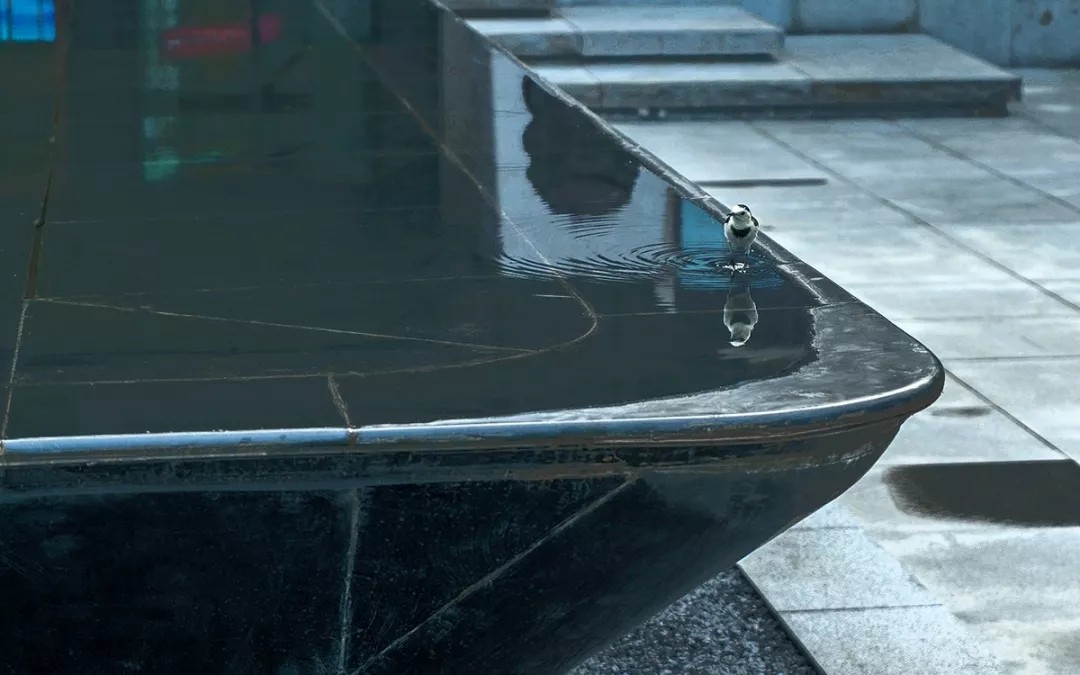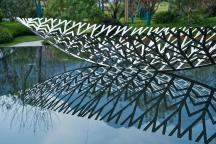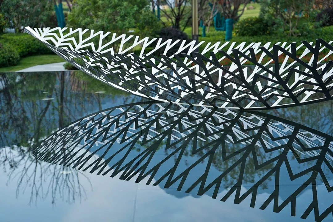 入口廣場(chǎng)主軸景觀對(duì)稱,景觀結(jié)合建筑特色強(qiáng)調(diào)簡(jiǎn)潔、悠閑的新東方度假風(fēng)情,中間布置濱水、自然的船型雕塑,銀色鏤空的雕塑立于靜水面上,體態(tài)輕盈,微風(fēng)吹過(guò),水波蕩漾,別有一番趣味。