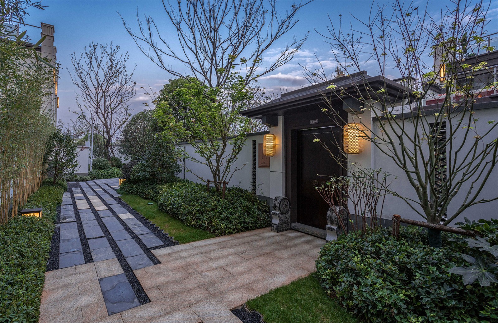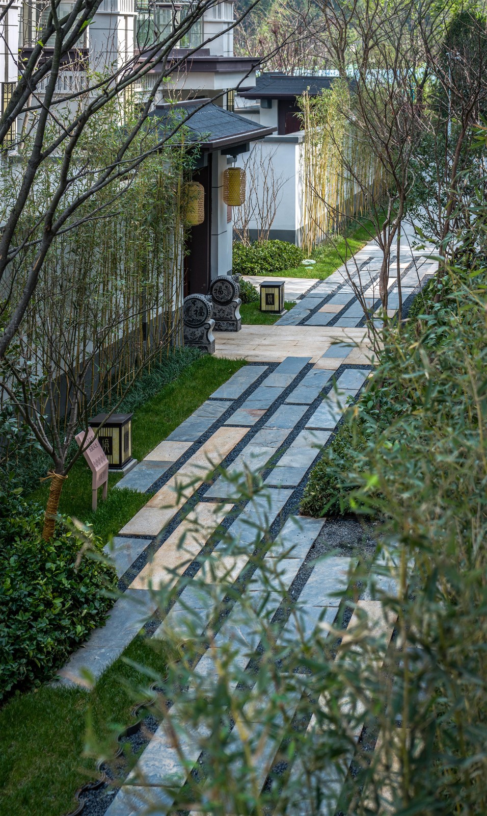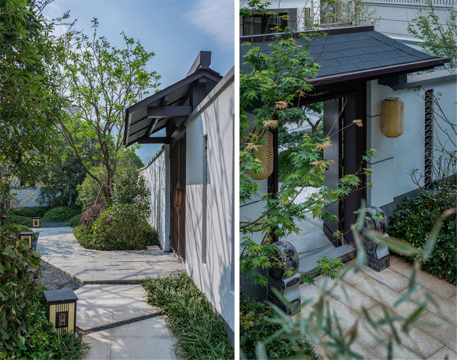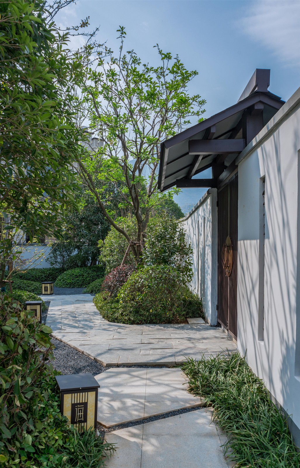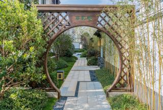 從組團(tuán)空間進(jìn)入后有不同氛圍的宅間巷道,從鋪裝到植物各有特色,依據(jù)建筑規(guī)劃及風(fēng)水宜忌,設(shè)計(jì)舒適的小院空間及門(mén)頭位置,錯(cuò)落有致的瓦片格柵點(diǎn)綴著白色的別墅院墻,中式大門(mén)加精美的抱鼓石,高低疏密有致的綠植結(jié)合不同肌理的地面石材,這些給人一種質(zhì)樸、優(yōu)雅、靈動(dòng)的宅間巷道感。