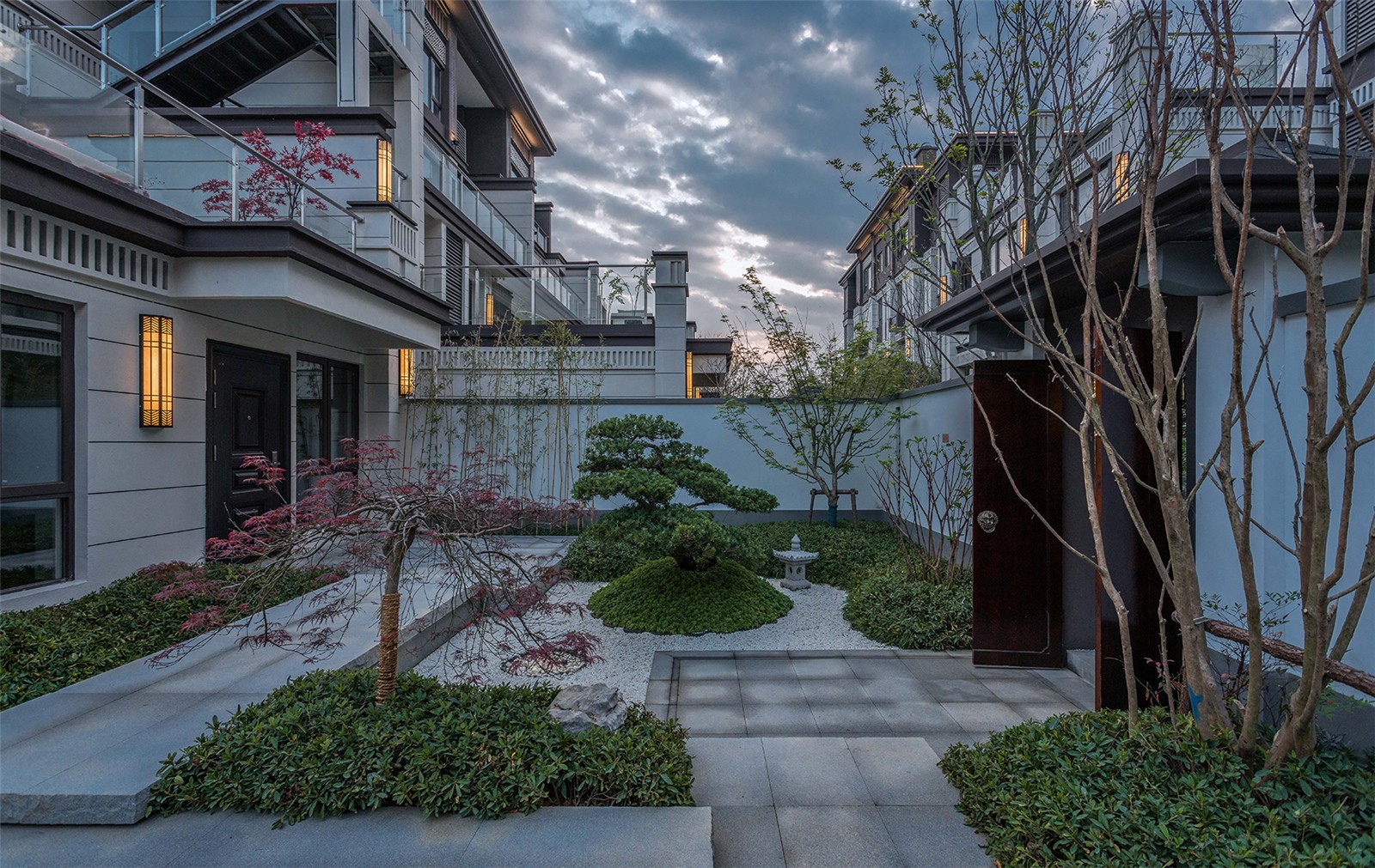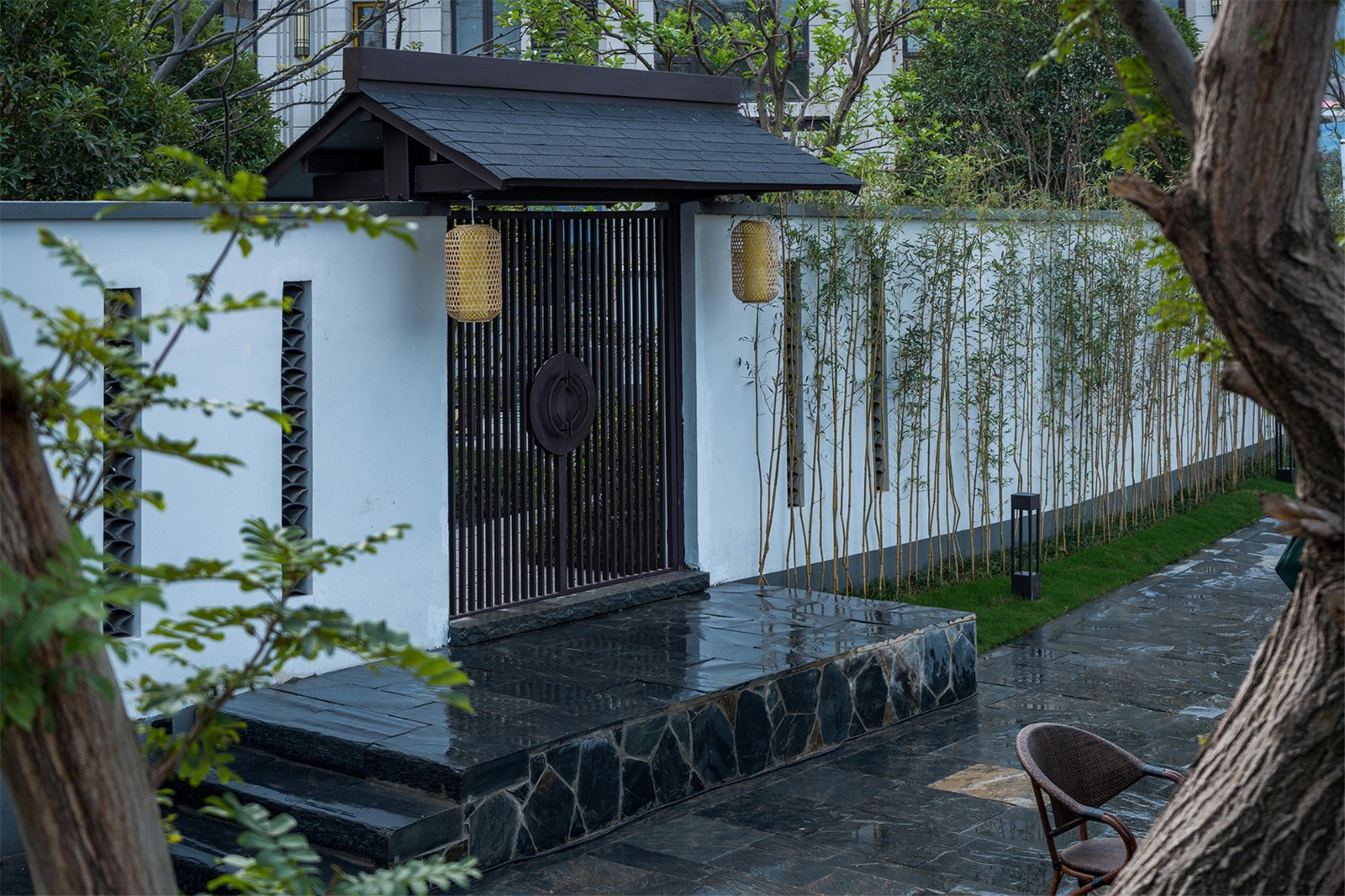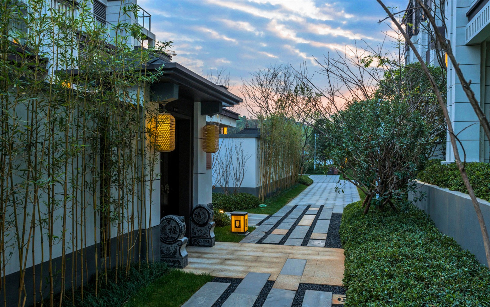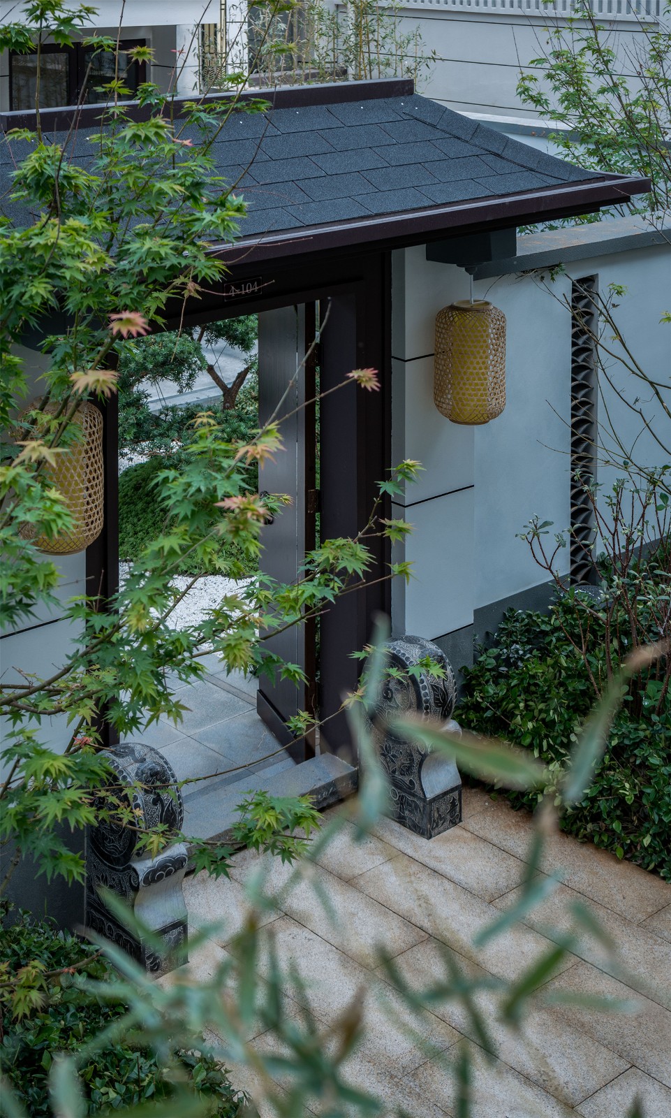 從組團(tuán)空間進(jìn)入后有不同氛圍的宅間巷道,從鋪裝到植物各有特色,依據(jù)建筑規(guī)劃及風(fēng)水宜忌,設(shè)計(jì)舒適的小院空間及門(mén)頭位置,錯(cuò)落有致的瓦片格柵點(diǎn)綴著白色的別墅院墻,中式大門(mén)加精美的抱鼓石,高低疏密有致的綠植結(jié)合不同肌理的地面石材,這些給人一種質(zhì)樸、優(yōu)雅、靈動(dòng)的宅間巷道感。