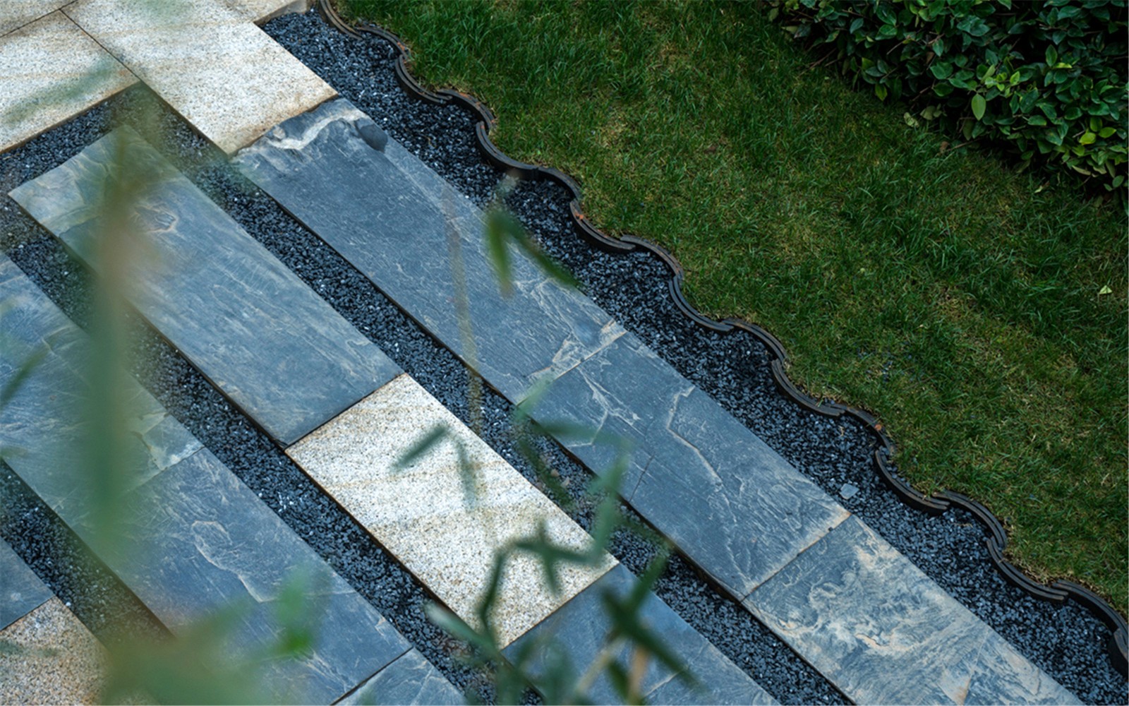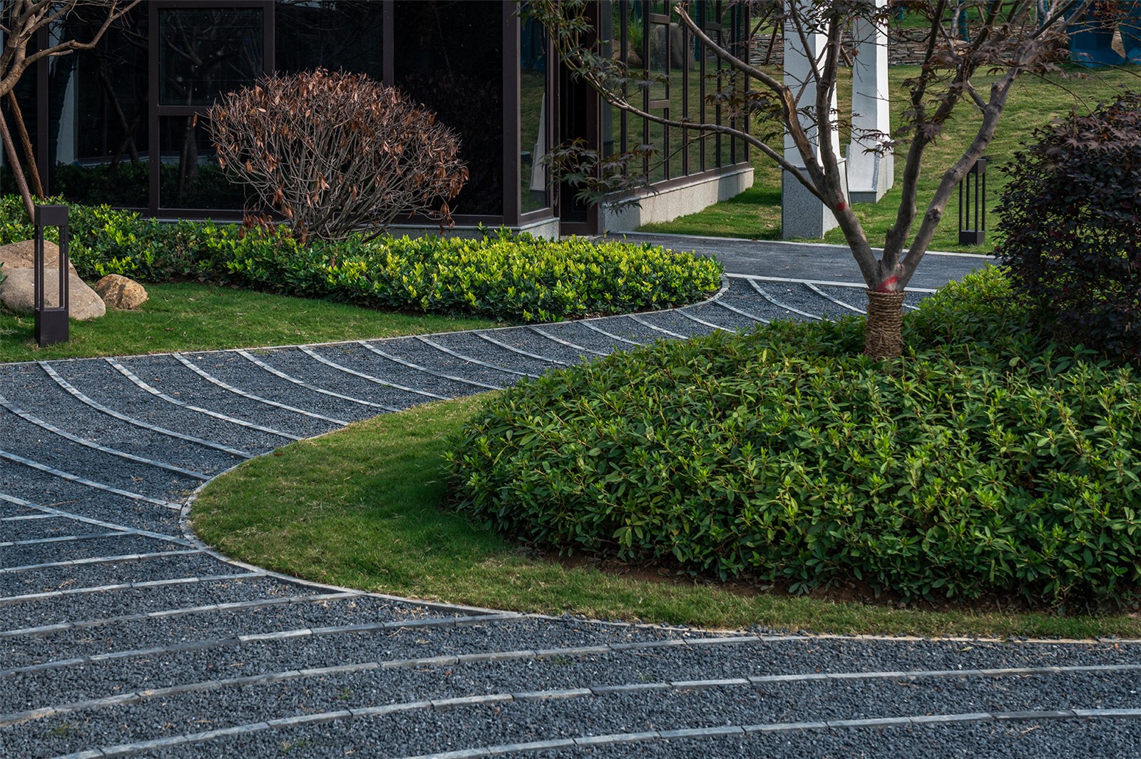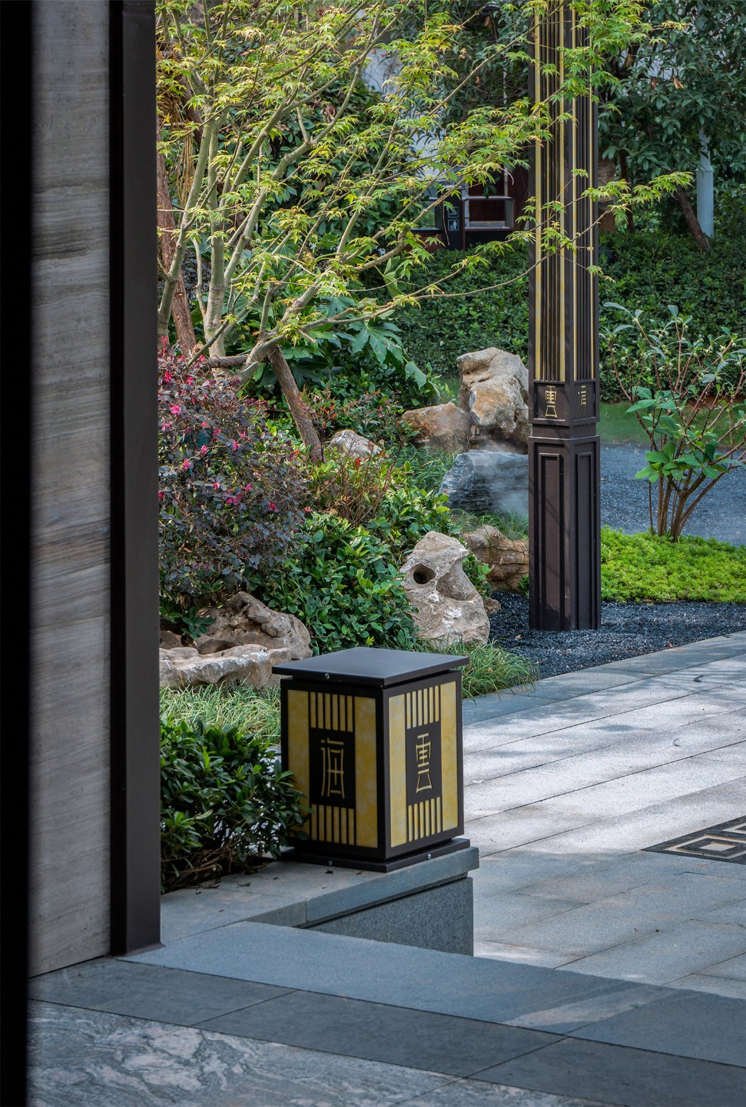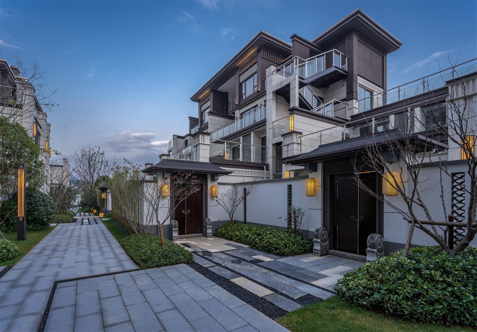 從組團(tuán)空間進(jìn)入后有不同氛圍的宅間巷道,從鋪裝到植物各有特色,依據(jù)建筑規(guī)劃及風(fēng)水宜忌,設(shè)計(jì)舒適的小院空間及門(mén)頭位置,錯(cuò)落有致的瓦片格柵點(diǎn)綴著白色的別墅院墻,中式大門(mén)加精美的抱鼓石,高低疏密有致的綠植結(jié)合不同肌理的地面石材,這些給人一種質(zhì)樸、優(yōu)雅、靈動(dòng)的宅間巷道感。
