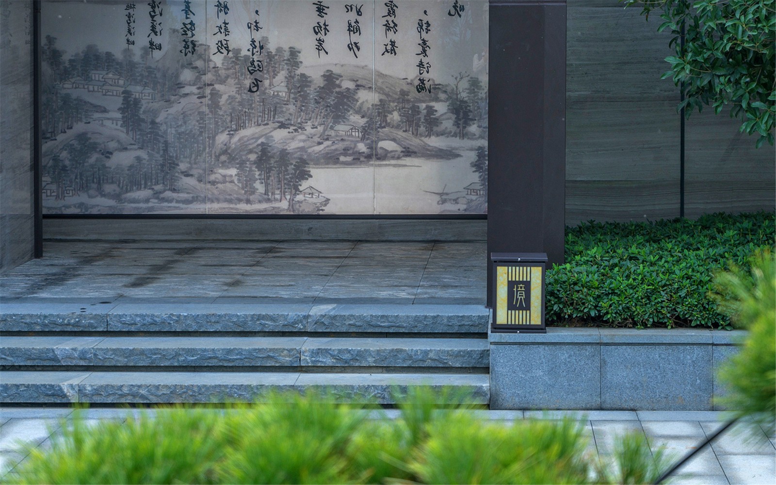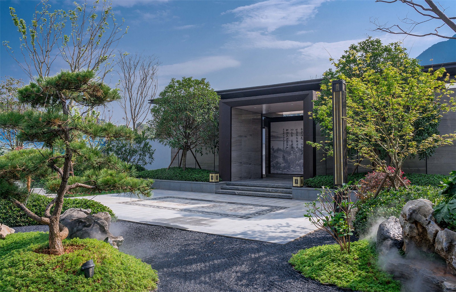 設(shè)計(jì)中希望用一個(gè)藝術(shù)雅致,并且尺度宜人的門(mén)面來(lái)表達(dá)項(xiàng)目輕松度假的氛圍特色,通過(guò)現(xiàn)代景觀的簡(jiǎn)潔加?xùn)|方神韻的意境,端莊不失靈性,典雅大氣不失細(xì)節(jié)刻畫(huà),為度假區(qū)樹(shù)立起一個(gè)清新自然、親近可人的富有儀式感的入口大門(mén)形象。