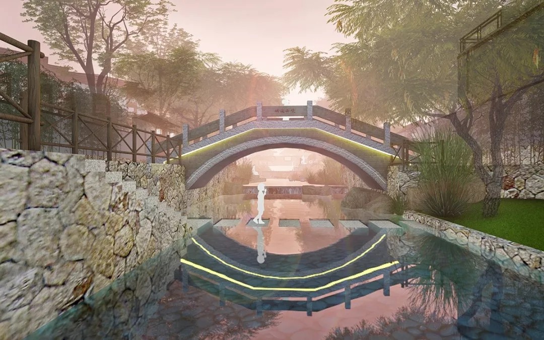 基于對(duì)場(chǎng)地環(huán)境的尊重,設(shè)計(jì)師對(duì)河道兩側(cè)的景觀做減法,保留原生大樹(shù),疏通河道,運(yùn)用當(dāng)?shù)氐氖膶?duì)河道的駁岸進(jìn)行整治美化,增添自然質(zhì)樸的景觀氛圍。