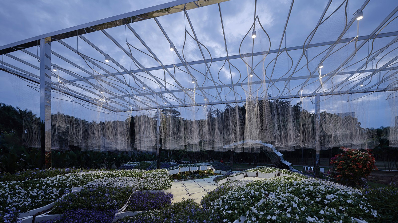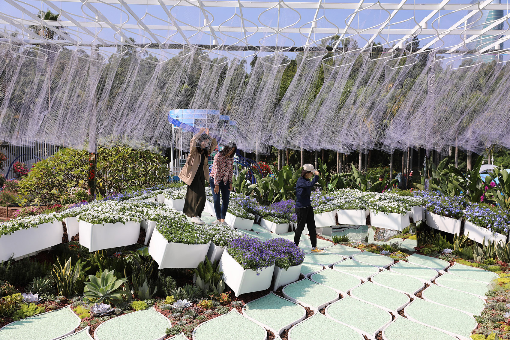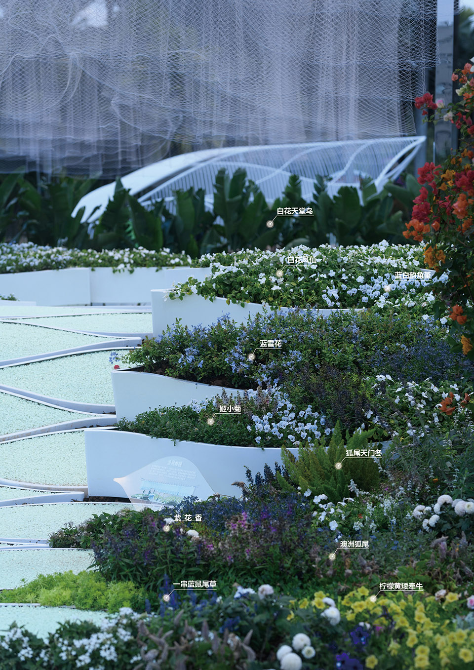 花園內(nèi) – 海浪與海底:種植于波浪起伏的種植盒內(nèi)的低矮花卉,由白色、淺藍(lán)色逐漸過(guò)渡到深藍(lán)色,宛如不斷翻涌的海浪。枝丫狀、直立狀,結(jié)有漿果且顏色多彩的多肉植物,搭配彩色葉草本,仿佛繽紛多彩的海底珊瑚礁群落。