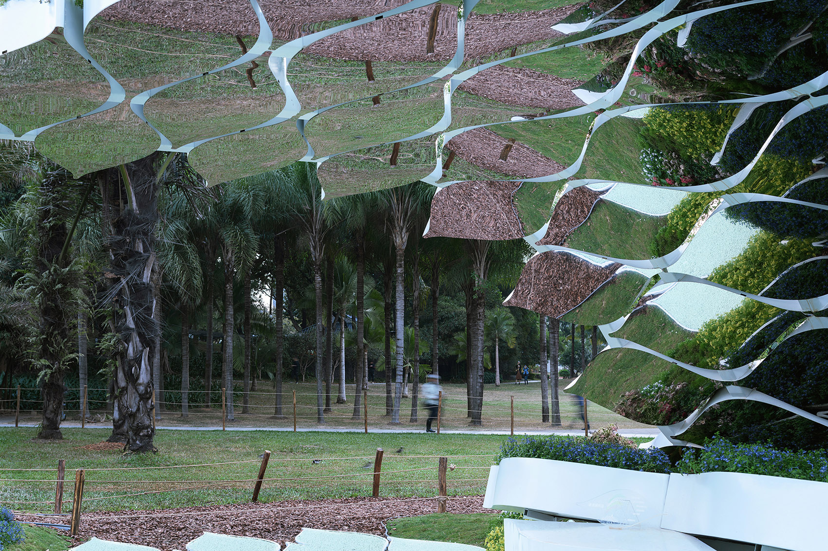 Besides the field of wave, the fish net trellis and wave pavilion trigger richer experience for visitors, through different forms of interaction. The fish nets hung under the trellis are so soft that light breeze easily make them swim like jellyfish. Visitors could “kiss” the nets in certain elevation as they move with the landforms. The wave pavilion rolls up with the “wave”, with plants on the roof, and mirror-finish panel under the ceiling. The mirror magically reflects different environment based on visitors’ location and viewing angle.
