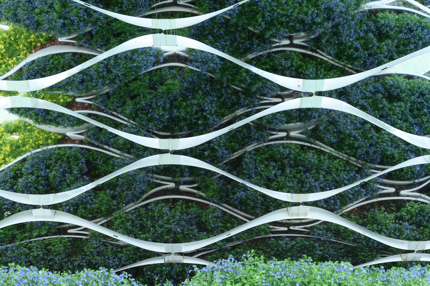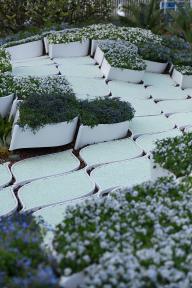 ▲低矮花卉種植在起伏的種植盒內(nèi),florescent shrub planted in corrugated planters ?南西攝影