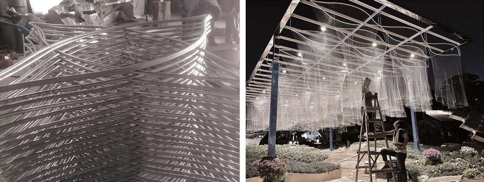 整個(gè)花園的建造周期為一個(gè)月,模塊化的建造體系(共335件預(yù)制鋁盒模塊)完美地適應(yīng)了緊湊的施工節(jié)奏。全園除漁網(wǎng)帷幔的結(jié)構(gòu)柱和逐浪廊架懸挑的種植盒采用局部焊接外,其余90%的材料均采用裝配化的形式快速搭建,這為更加精細(xì)的植物的養(yǎng)護(hù)爭(zhēng)取了更多的時(shí)間,為迎接游客做了更為充分的準(zhǔn)備。然而,每一道施工步驟我們都反復(fù)推敲、試錯(cuò)并不斷改進(jìn)。