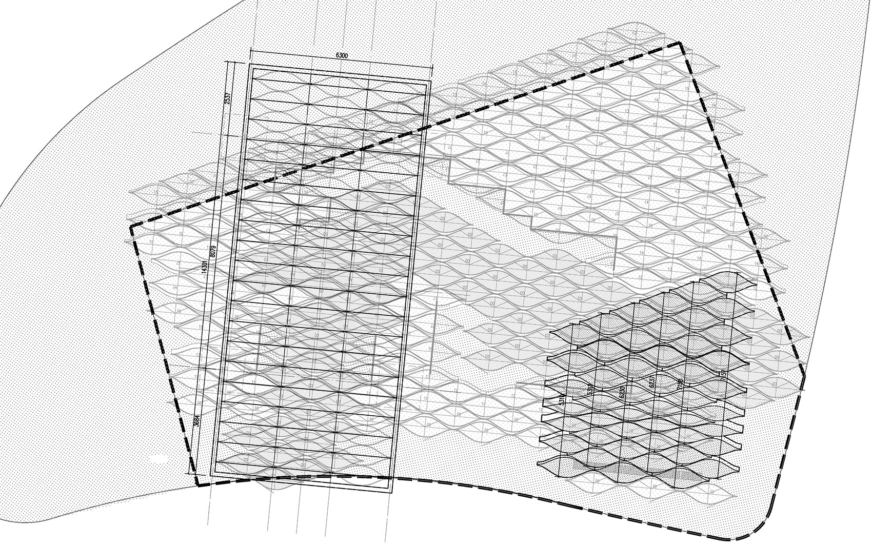 除了海浪地形外,與地面模塊肌理相同的“漁網(wǎng)帷?!焙汀爸鹄死燃堋?,以不同的形式與參觀者互動(dòng)。漁網(wǎng)帷幔輕柔通透,游客可隨著地形起伏,與帷幔產(chǎn)生不同程度的接觸,或輕撩觸碰或隔網(wǎng)探望。由“海浪”翻卷而起的逐浪廊架,頂部延續(xù)了肌理化的種植,底部則以鏡面映射著四周。不同的時(shí)段,不同的位置,不同的視角,呈現(xiàn)出不同的景致。