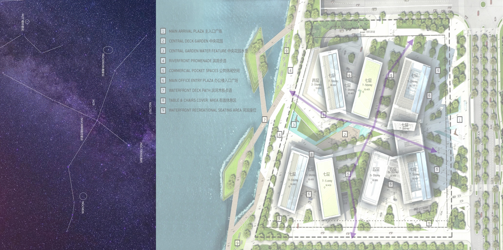 項(xiàng)目西臨金山湖,東臨迎河?xùn)|路,周邊主要為商業(yè)辦公及住宅用地,總體風(fēng)貌與區(qū)域規(guī)劃定位和周邊環(huán)境協(xié)調(diào)又具有個(gè)性。景觀設(shè)計(jì)根據(jù)建筑規(guī)劃,整體采用天鵝座形態(tài)的「十字星」布局,交叉匯聚的流線體現(xiàn)了「融·匯」的景觀主題。