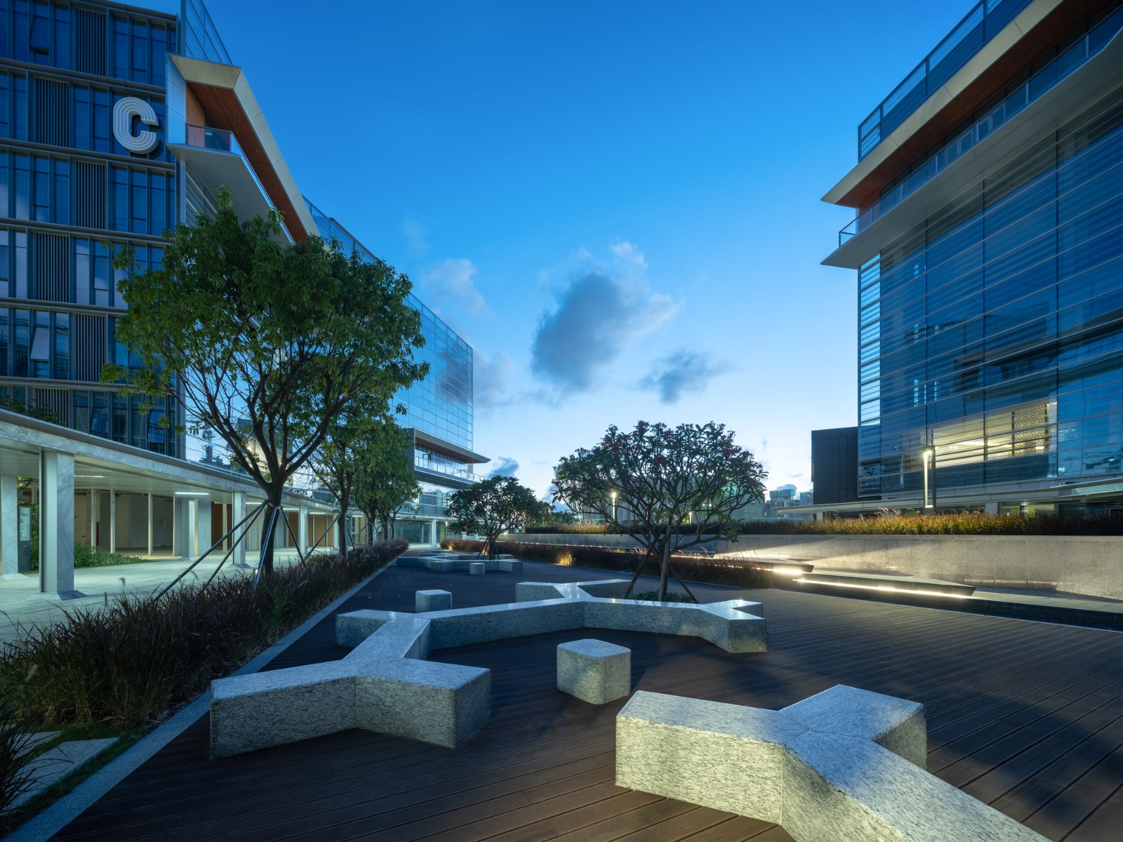 建筑林立的產(chǎn)業(yè)服務(wù)中心主要由創(chuàng)業(yè)型和政府服務(wù)辦公類人群使用,景觀設(shè)計(jì)的初衷是在場(chǎng)地內(nèi)營(yíng)造出多個(gè)適宜于停留、休憩和交流的戶外友好空間,尤其是景觀視線與向心力俱佳的中心庭院。