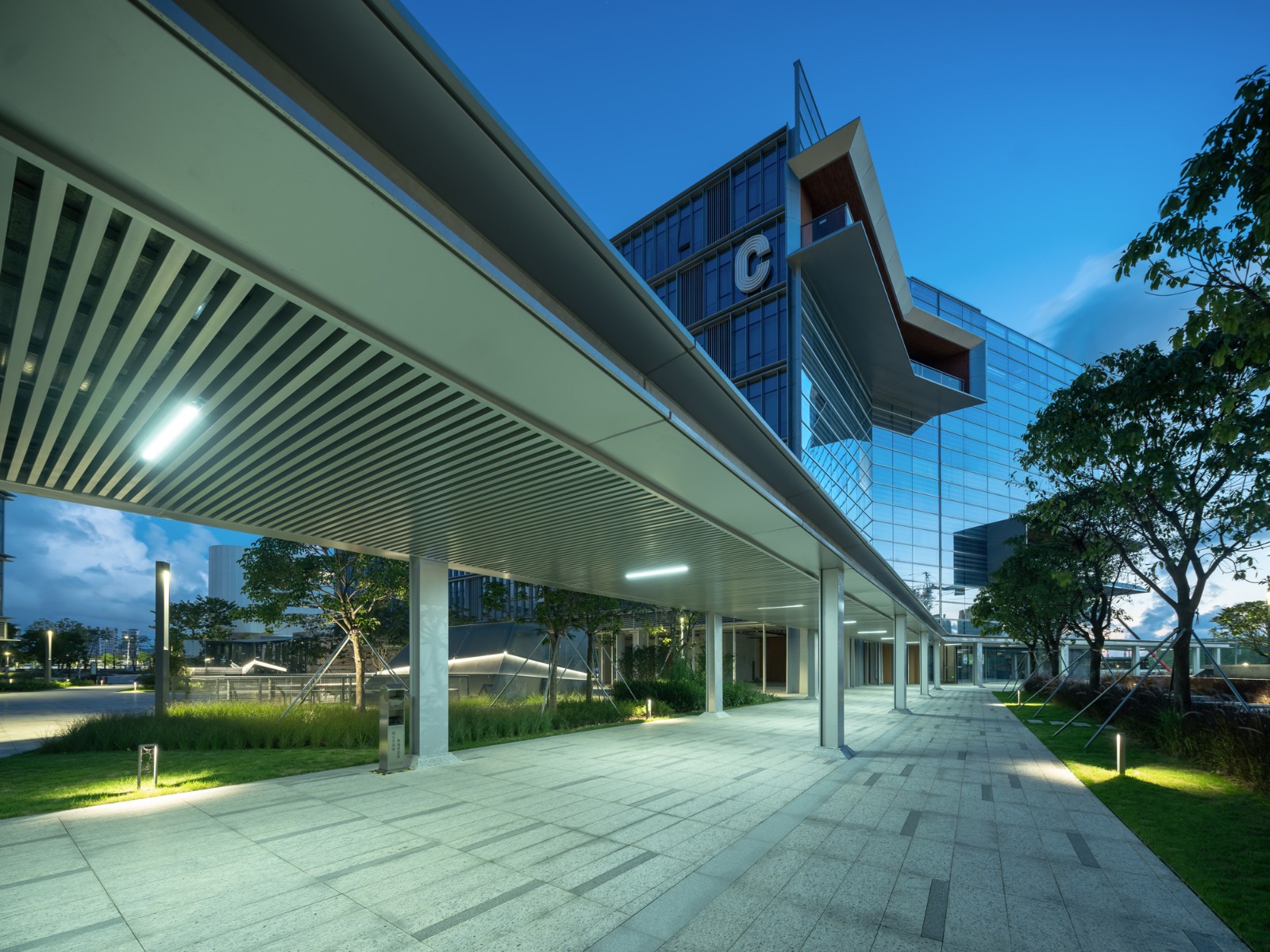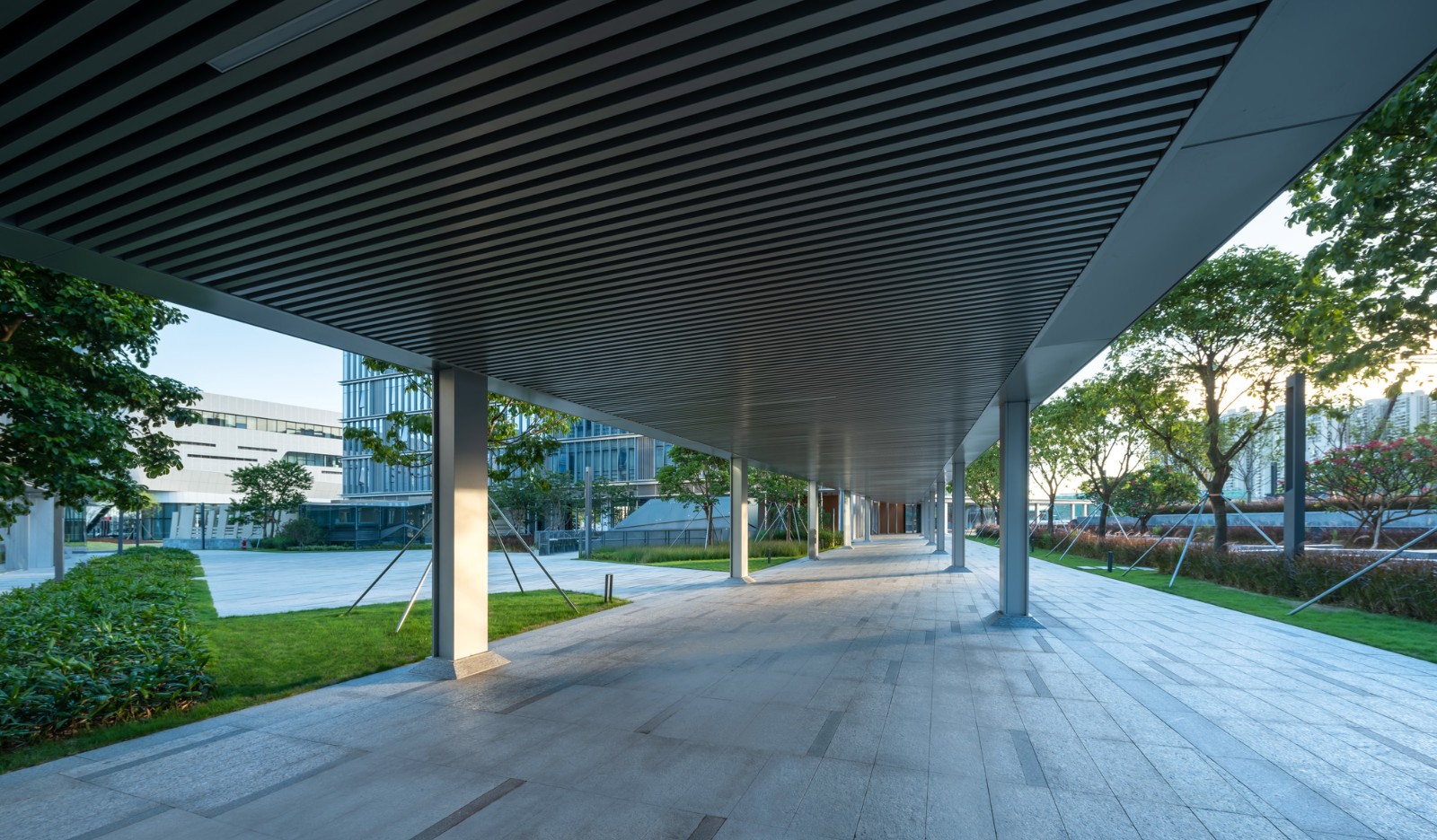 亞熱帶氣溫較高,常年處在日曬雨淋的氣候環(huán)境,靠中心庭院一側(cè)設(shè)置了兩排之字型戶外連廊,讓人們?cè)趫@區(qū)內(nèi)通行可以遮陰蔽雨,增加了步行通達(dá)的舒適性。
