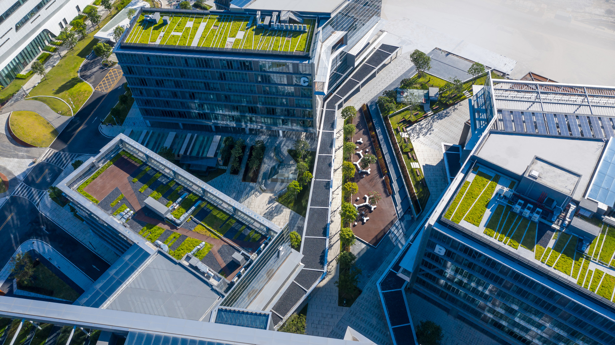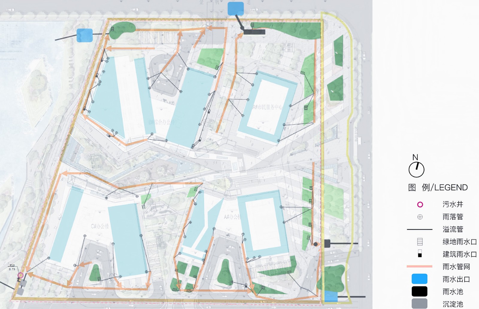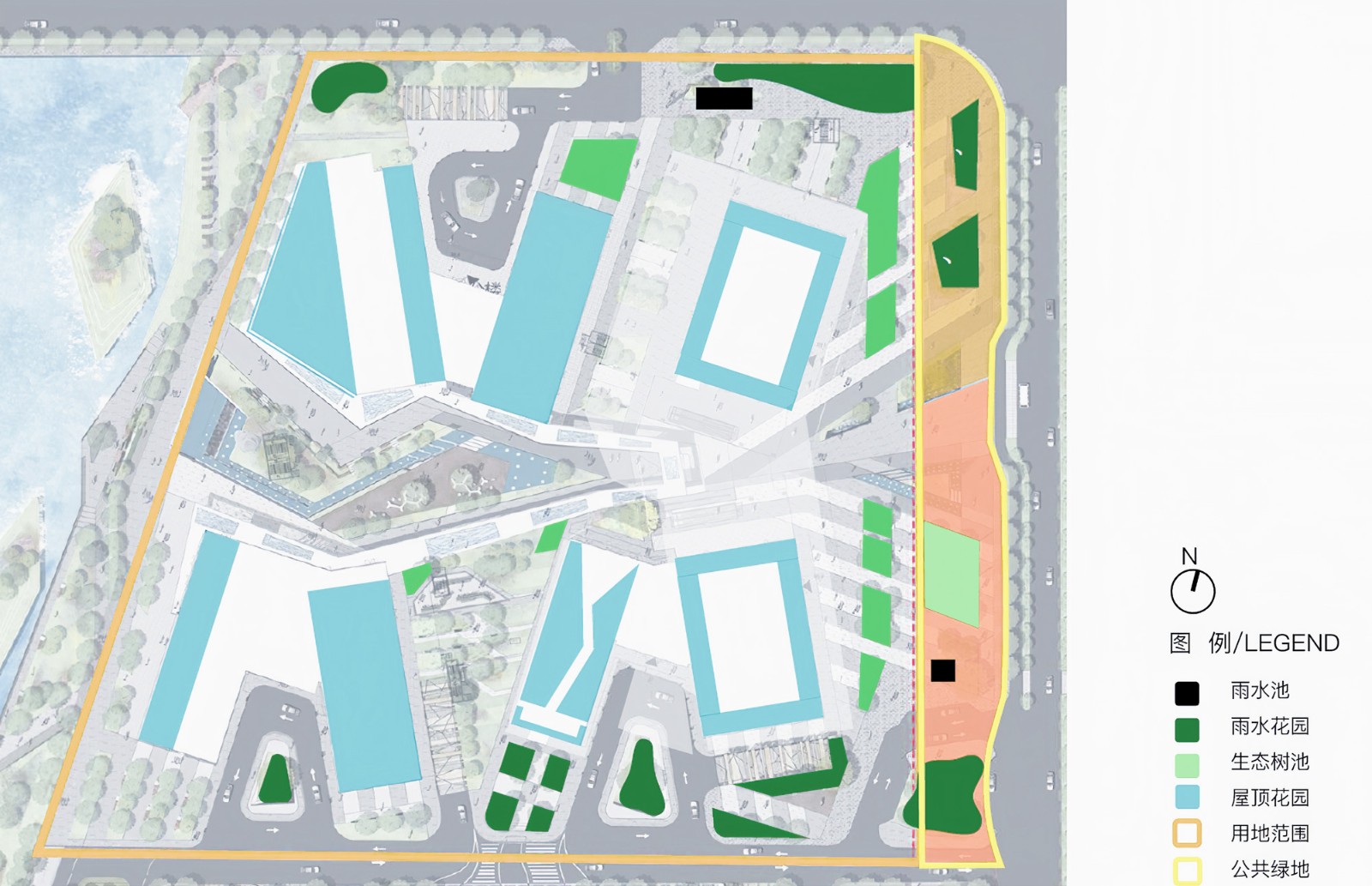 在景觀設(shè)計(jì)中,針對(duì)不同場(chǎng)地有機(jī)選用合理的海綿手段,使雨水花園、綠色屋頂及生態(tài)樹(shù)池等多元設(shè)施很好地融入環(huán)境協(xié)同運(yùn)作,打造出綠色可持續(xù)、易管理運(yùn)維的親自然辦公園區(qū)。