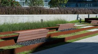 屋頂花園營(yíng)造出多個(gè)立體休憩、觀景區(qū)域,為使用者提供了較佳的空中觀景視線;綠色屋頂?shù)闹脖缓透采w物提供了良好的降溫節(jié)能與雨水緩滯功能。