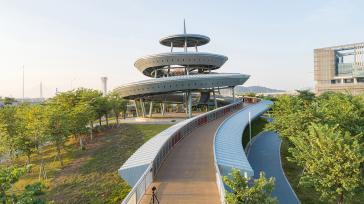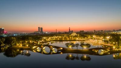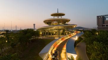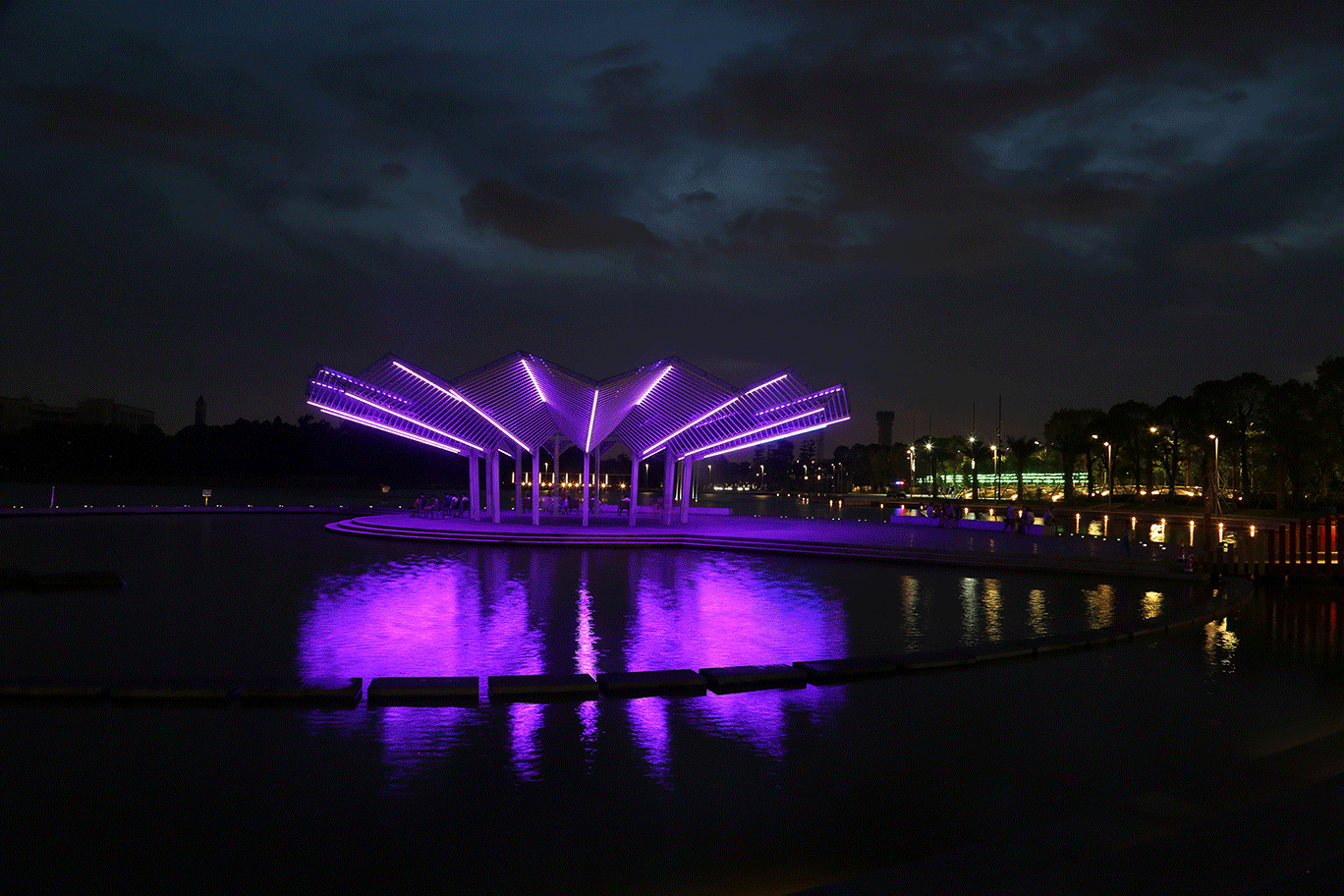千紙鶴:嶺南傳統(tǒng)折紙藝術(shù)與現(xiàn)代形式結(jié)合,與水月橋、鳳凰橋相連,形態(tài)輕盈,宛如漂浮在水面的一個(gè)月亮,與水天相互映襯。