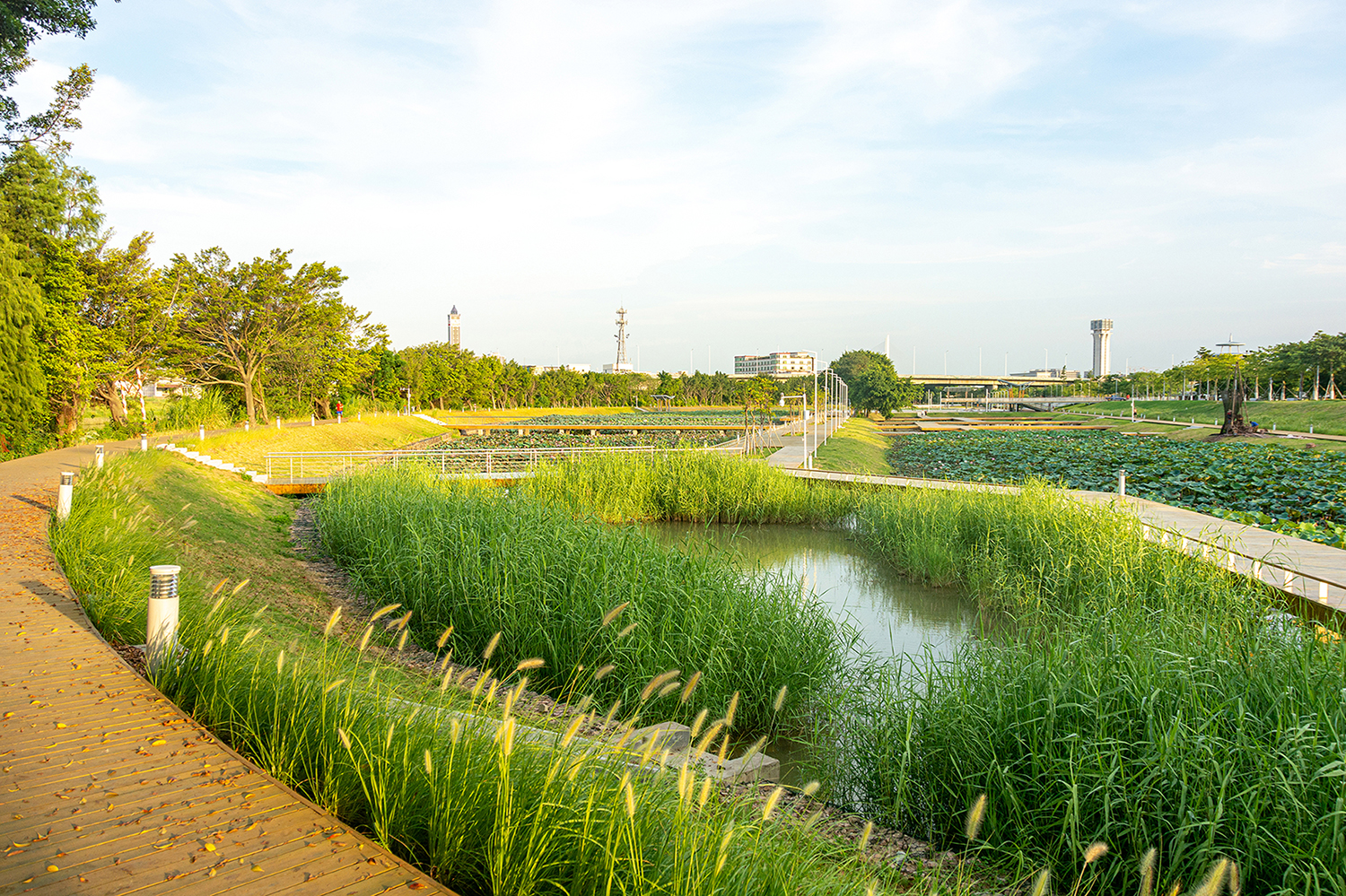 設(shè)計(jì)保留原場(chǎng)地現(xiàn)狀密林、荷塘、堤路,提升改造形成湖中小島、荷花濕地、特色漫步道。新建文翰湖、改造河漫灘增加泄洪區(qū),沿河岸設(shè)計(jì)可淹沒(méi)區(qū),增強(qiáng)水道的行洪能力。公園水系有湖體、凈水池、荷塘濕地、雨水花園等多種水體形態(tài),形成可持續(xù)系統(tǒng)化的雨水收集系統(tǒng),雨水收集凈化的同時(shí)也對(duì)河流水質(zhì)進(jìn)行一定凈化,保證親水安全。