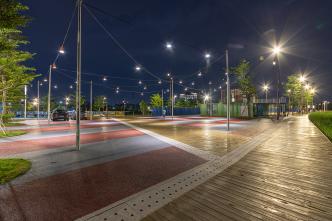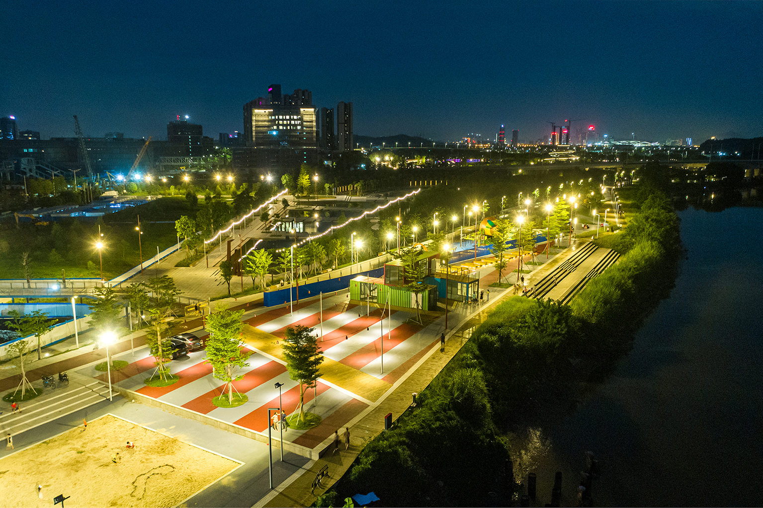 夜間燈影營(yíng)造公園浪漫的氛圍,協(xié)調(diào)公園的起承轉(zhuǎn)合。