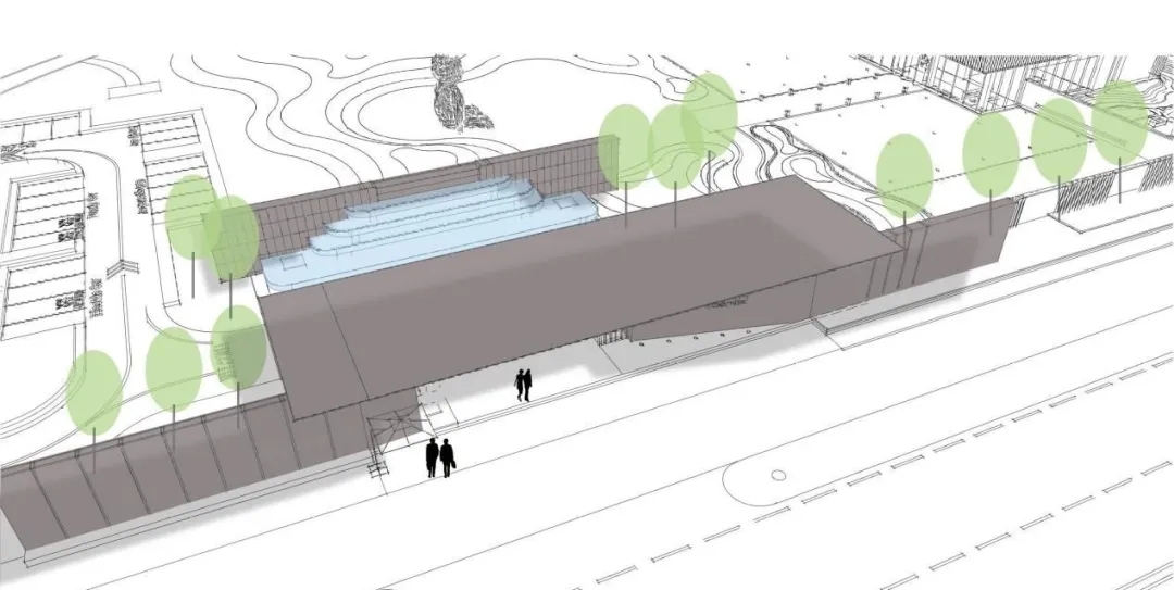 以延續(xù)景墻打造圍合空間,形成品質(zhì)序列城市界面景觀。入口景墻通過合理的尺度空間推敲,以轉(zhuǎn)折形式結(jié)合水景設(shè)計(jì),也是利用轉(zhuǎn)折心理作為過渡空間,使其具有引導(dǎo)作用。