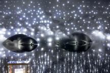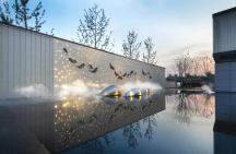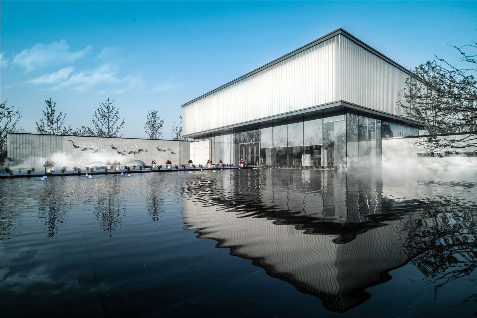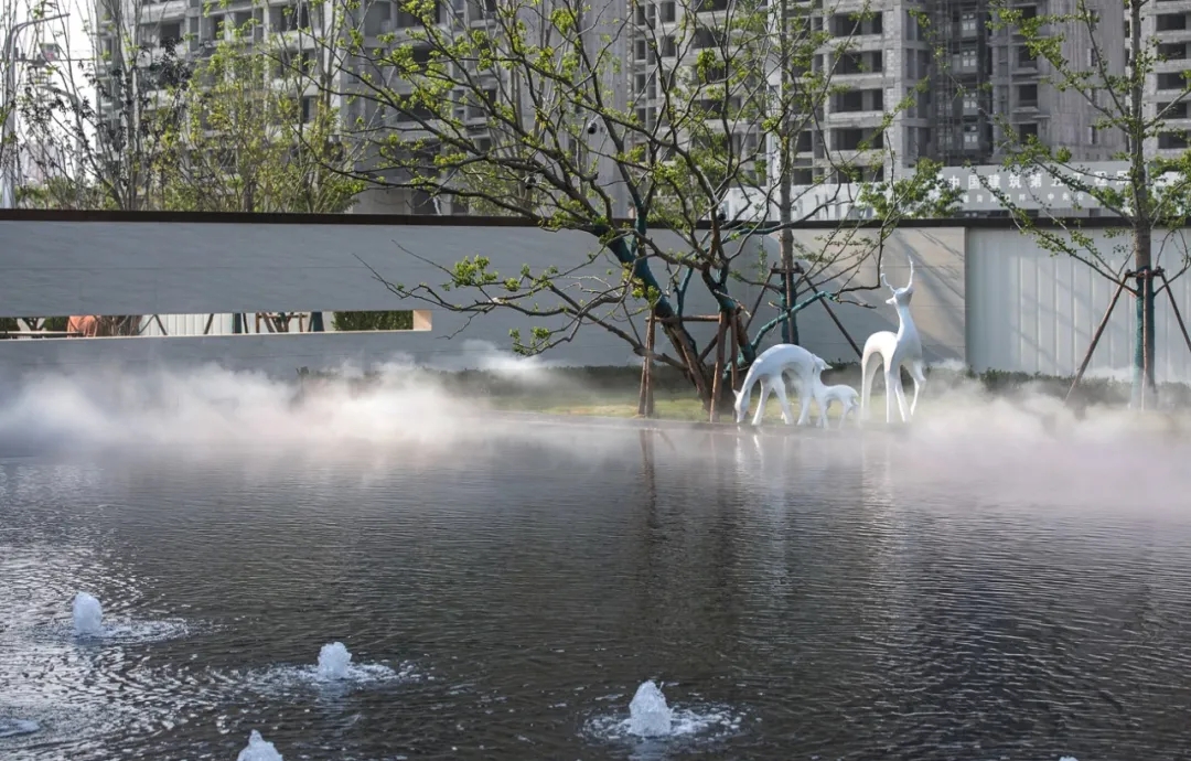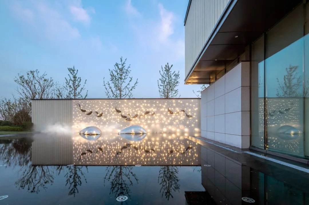 ▲ 游魚主題的景墻結(jié)合穿孔板,燈光營造出星光點(diǎn)點(diǎn)的意境;同時(shí)大面積的水景結(jié)合水中游魚雕塑,水中倒影,如銀光灑落,微風(fēng)輕拂,波動(dòng)的水面,創(chuàng)造出魚游星河的視覺效果,激起內(nèi)心一陣漣漪。