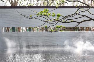 ▲ 詩意的生活需要儀式感,現(xiàn)代感門頭主入口,結(jié)合立體雕塑,體現(xiàn)現(xiàn)代藝術(shù)的氛圍。框景門內(nèi)雅致的疊水,與門前小泉涌相為呼應(yīng),為原本簡潔的大門增添了一絲流動(dòng)的詩意。