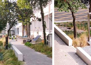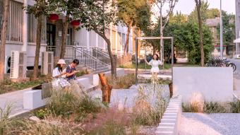 The school authorities were hoping not to make too many changes, which happened to coincide with our thoughts: The goal of the design is to achieve the most abundant functions with the least amount of intervention on the site. First, we retained the heavily used sidewalks on both sides of the site, and second, we retained and utilized all the trees on the site. A small square of 5m by 5m is defined by the odd persimmon and walnut trees. The square divides the long and narrow green space into a larger and a smaller bioretention. We then reduced some of the retention ponds to provide parking space for bikes that used to take up the sidewalk.