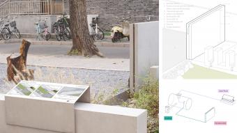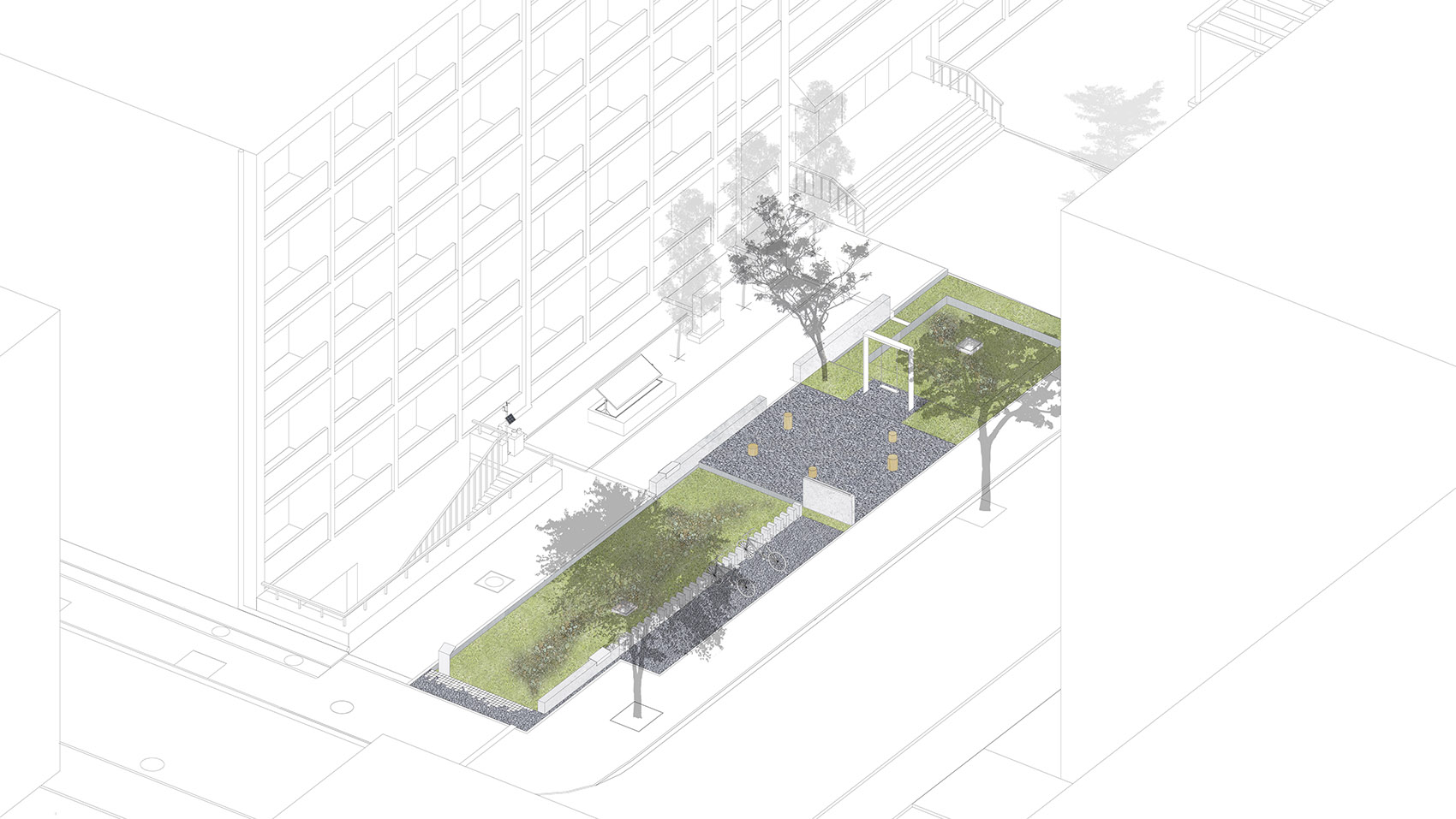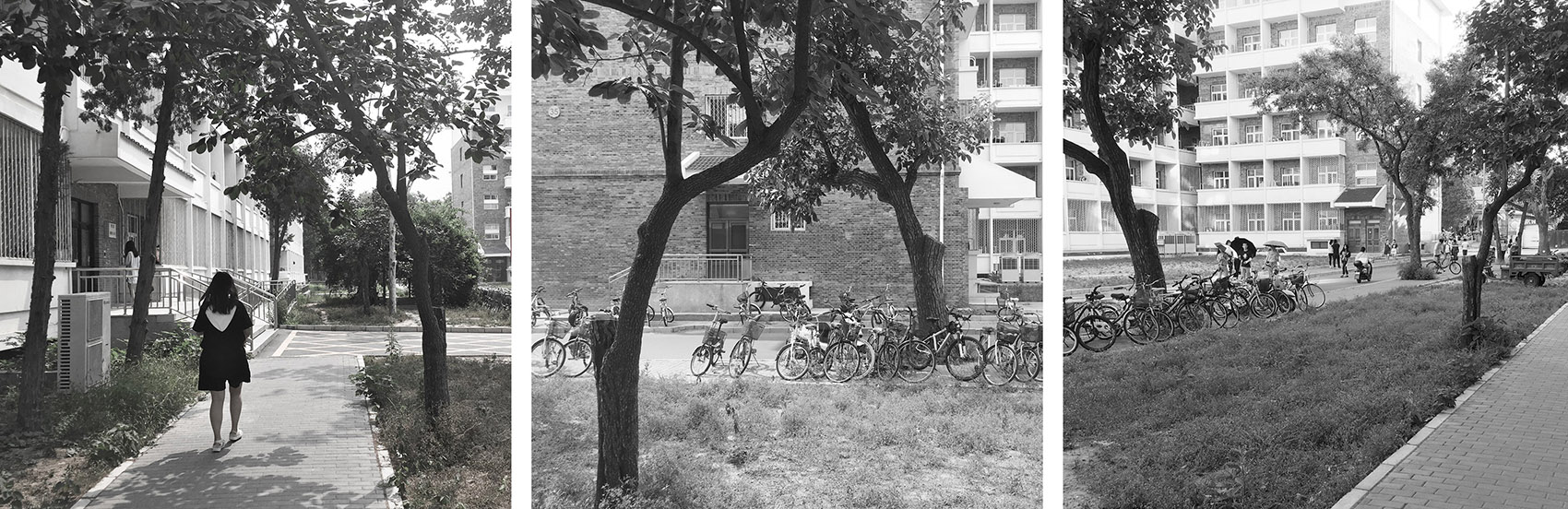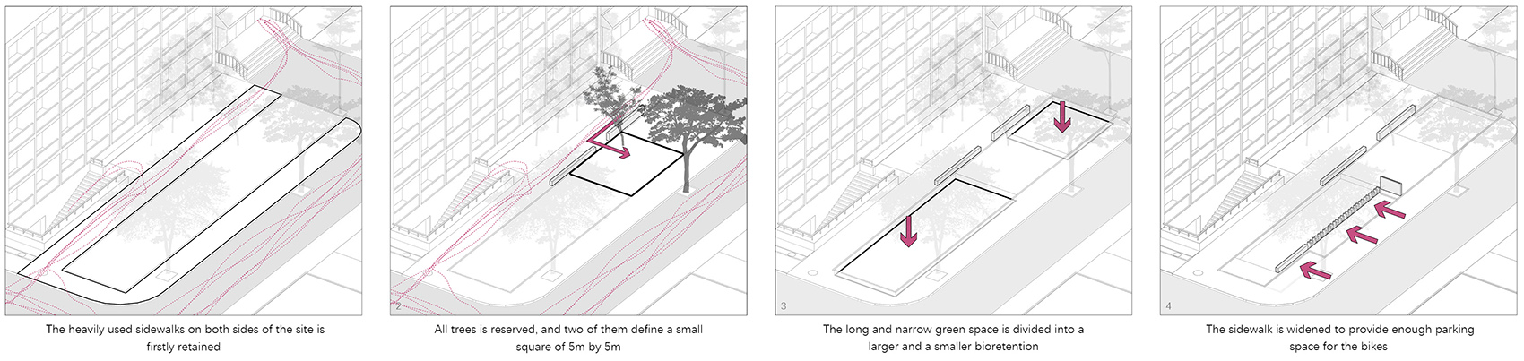 校方希望原貌不有太大改動,這正好和我們的想法不謀而合:設(shè)計希望對場地施加最小的干預(yù),實現(xiàn)最豐富的功能。我們首先保留了場地兩側(cè)被頻繁使用的人行道,其次是對場地原有的樹木的保留和利用。柿子樹和核桃樹限定出了主要的活動場地,同時將狹長的綠地分成一大一小兩個生物滯留池。然后我們減少了一部分滯留池,為原本占用人行道的自行車提供停車空間。
