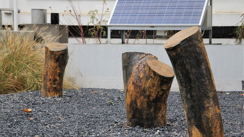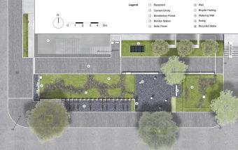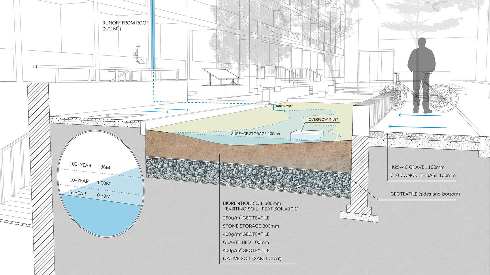 Due to the proximity of the building, a slow seepage structure is set on the bottom and sides of the bioretention to avoid the adverse effects of too much rainwater concentrated in a short time. When it rains, part of the rainwater directly infiltrates to supplement the groundwater, and the rainwater that is too late to seep is temporarily stored in the rainwater tank. When the rain has passed and the solar radiation reaches a certain level, the water pump will start. Temporary rainwater is returned to the ground through a solar pump to water the plants.
