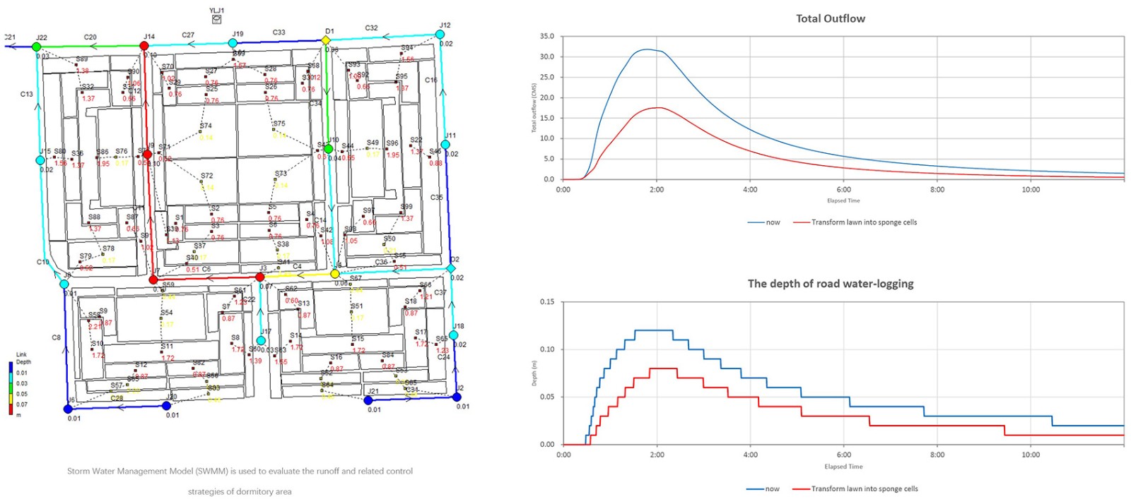 The garden can manage the runoff generated by the surrounding impervious surface of 572 square meters, reducing up to 16 cubic meters of rainwater for the dormitory area. The SWMM simulation results show that if the other green areas in the dormitory area are similarly transformed, a total of 47.8% of runoff flow can be reduced, which will greatly reduce the burden on municipal pipelines and effectively alleviate waterlogging.