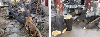 The persimmon and walnut trees, both of which happened to have their crowns cut in half during construction in 2016, received the most attention for their peculiar pose. They stand opposite each other, highlighting the boundary of a small square of 5m by 5m. Among them, the persimmon tree with most of its canopy cut off was extremely mutilated. If you look at it from the east or west, its canopy looks very lush, like a pavilion. So we left an entrance under the tree so that pedestrians can turn into the site just under the canopy of the persimmon tree. As a sign of the entrance, the persimmon tree is given a symbolic meaning.