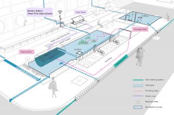 ▲存儲的雨水在天晴時通過太陽能回到地面澆灌植物,The stored rainwater is returned to the ground through solar energy to water the plants ?Hao zhang, Kangfu Zhuo