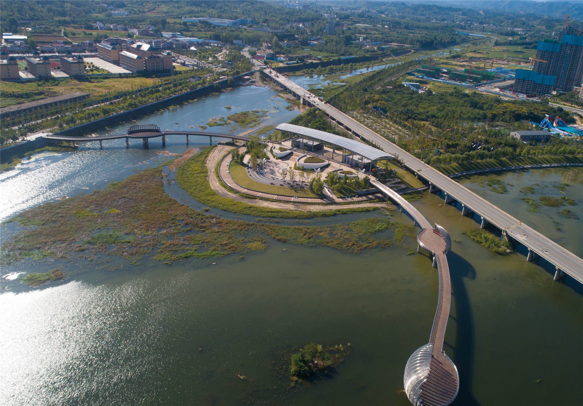 鸛河生態(tài)文化園位于河南省西峽縣城區(qū)鸛河西岸,北起封店橋,南至仲景大道橋,西側(cè)為寺山公園及規(guī)劃居住用地,東與中心城區(qū)隔河相望,總長度約5800米,總規(guī)劃設(shè)計面積約30.4萬平方米。