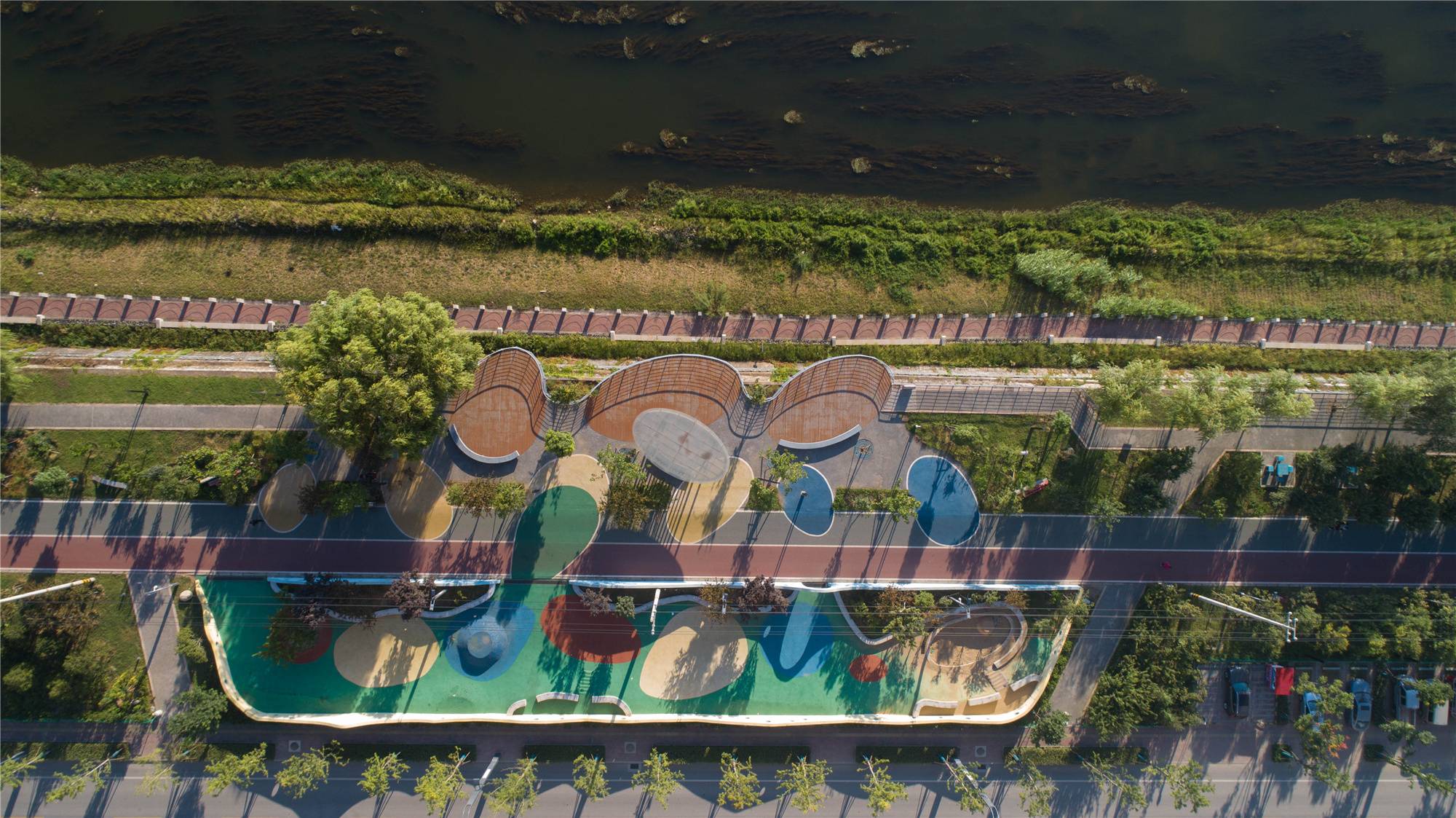 The original Riverside Road in the south section is close to the river, and the space for people's activities is narrow and unsafe, while the green belt is on the outside of the road, and many entrances separate the green belt. In order to effectively integrate the landscape green space, improve the hydrophilicity of the river and weave the urban slow traffic system, the green belt is adjusted to the riverside on the premise of meeting the upper planning, and the riverside road is set on the outside of the green belt, and the west half of the original riverside road is reconstructed For cycling and running roads, the east half is used as a park green space, and the sponge city technology is integrated into it, which integrates the “urban green corridor” to shorten the relationship between people and river, provide waterfront green space for people, and create a transition zone between city and natural ecology.