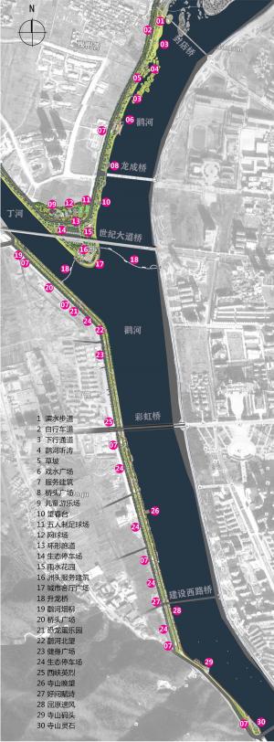 The project land is divided into two rivers and three banks by the river, and pedestrian traffic is inconvenient. Through combing the scattered urban green space, this plan integrates into a 5,800-meter long connecting greenway, including cycling path, running path and walking path, and builds a pedestrian bridge connecting the two sides of the river with the delta, so as to form a coherent system of slow traffic and improve and sew the urban greenway. In addition, the bridge is not only the most comfortable and convenient way to connect the east and west sides of The Stork River, but also the best place to enjoy the beautiful scenery on both sides of the Stork River.