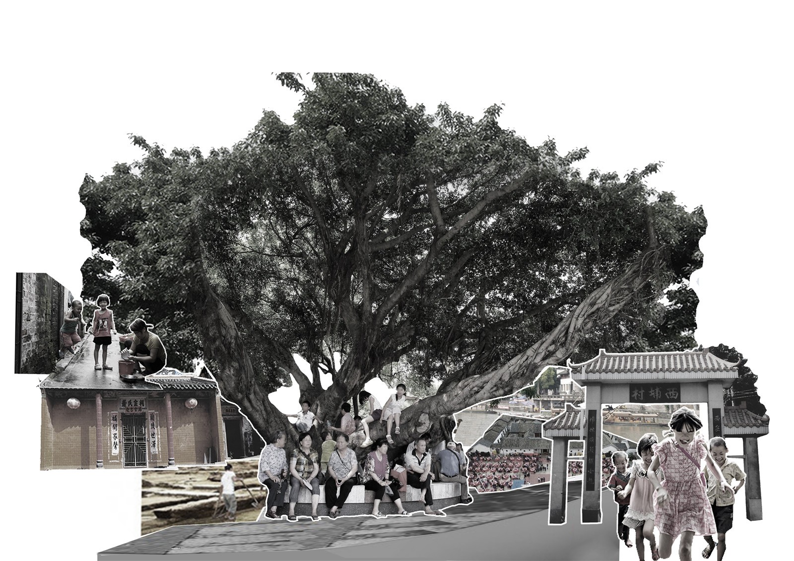 The village memory display area simplifies the texture of the old West Village to the format of base drawing to form a pavement with the characteristics of engraving the village memory, creating a space recognition and continuing the original memory of the place. In the centre of leisure stools, a large-leaf banyan tree is planted to form the cohesiveness for the space while it shades for pedestrians.