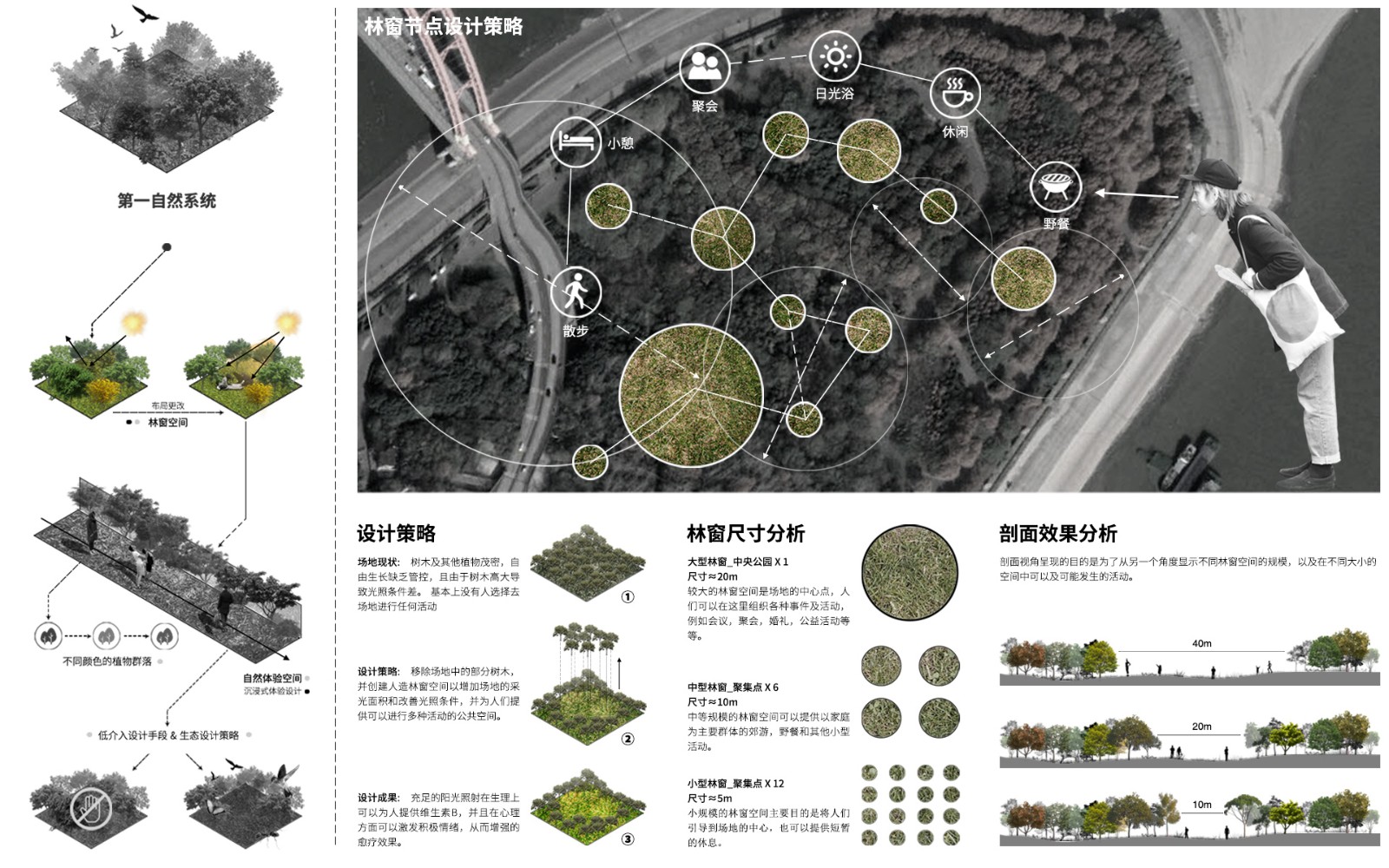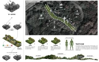 ▲第一個(gè)節(jié)點(diǎn)是林窗,目的是打開原本封閉的林內(nèi)空間,讓陽光能夠照到場(chǎng)地內(nèi)部,并提供空間給人們進(jìn)行活動(dòng)。